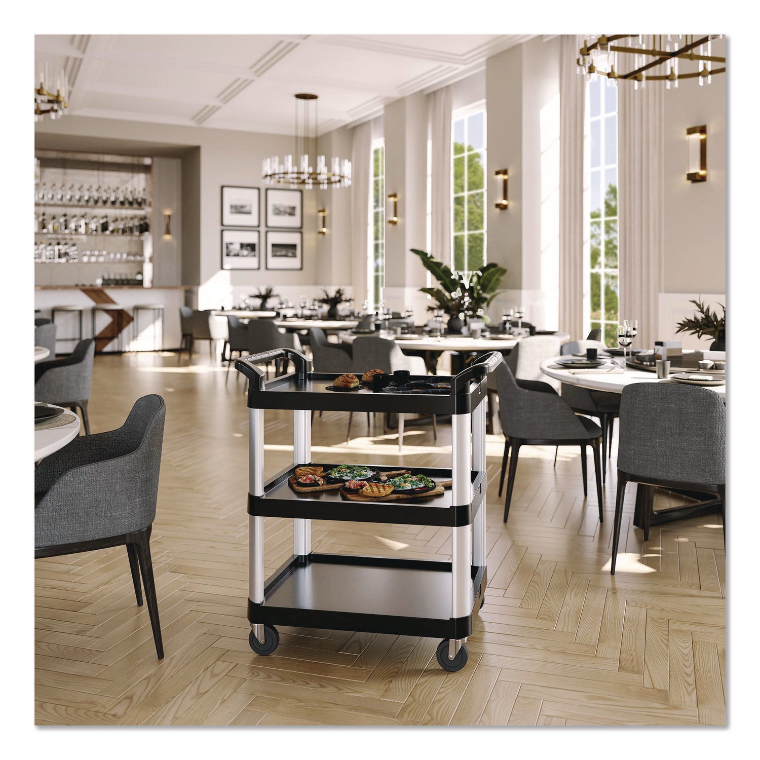 Suncast Commercial® Three-Shelf Service Cart, Metal/Plastic, 3 Shelves, 300 lb Capacity, 20" x 39.85" x 38.17", Black