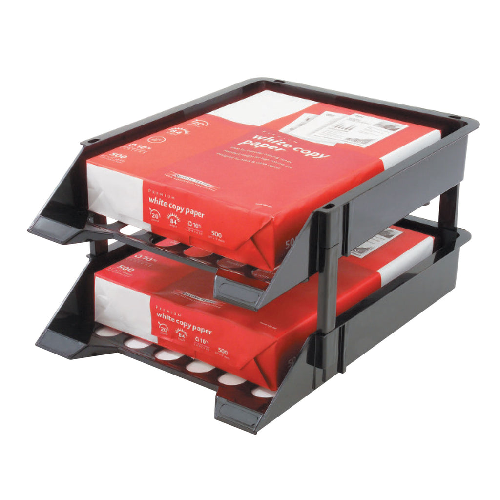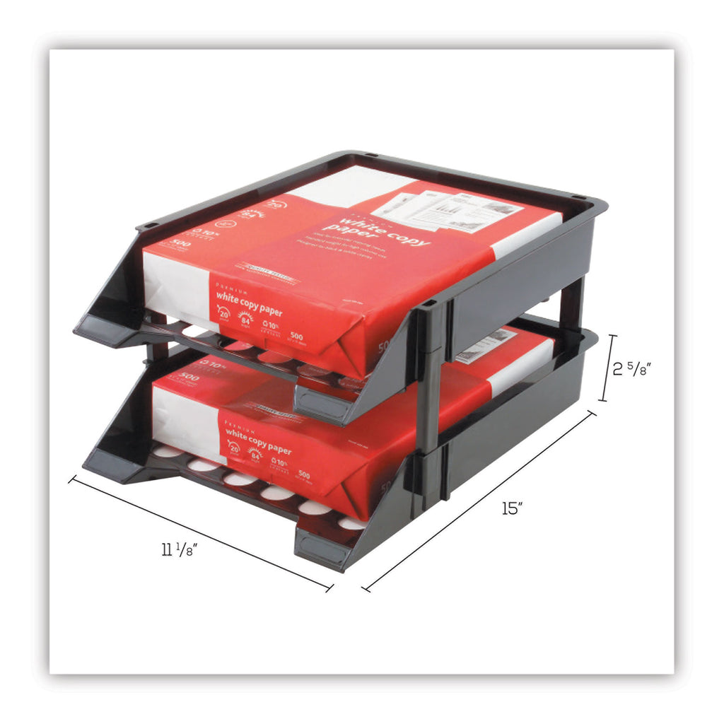 Break-resistant, industrial-duty trays hold heavy items, yet are lightweight. Labeling area on each tray (labels not included). Stacks with matching plastic risers. Durable plastic. Two trays plus four 3" and four 5" plastic risers per set.