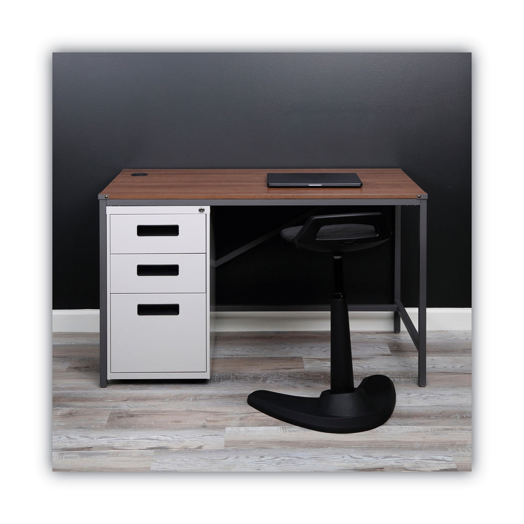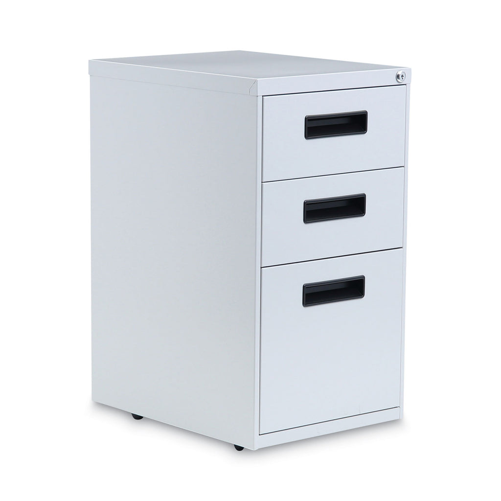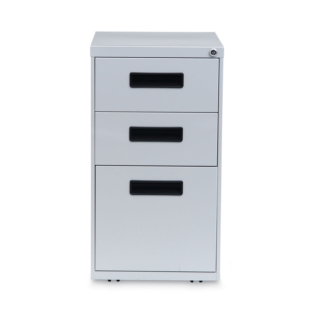 High-sided file cabinet for letter or legal-size filing. Counterweight prevents tipping. Visible, easy-access casters, two locking. Steel ball bearing slide suspension helps drawers glide smoothly and with ease. 3/4 extension on box drawers and full-length extension on file drawers for maximum accessibility. Full-length pull. Box drawers include one divider and pencil tray.