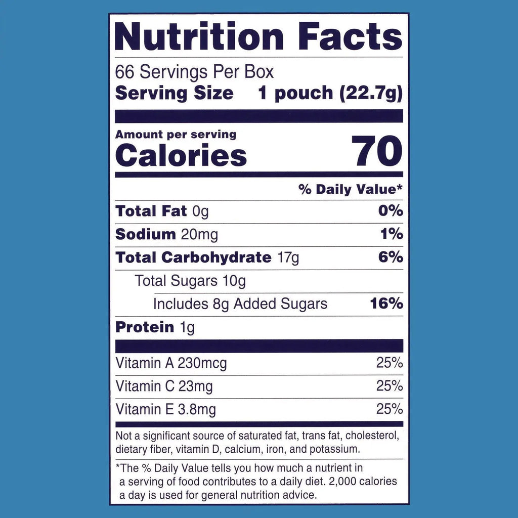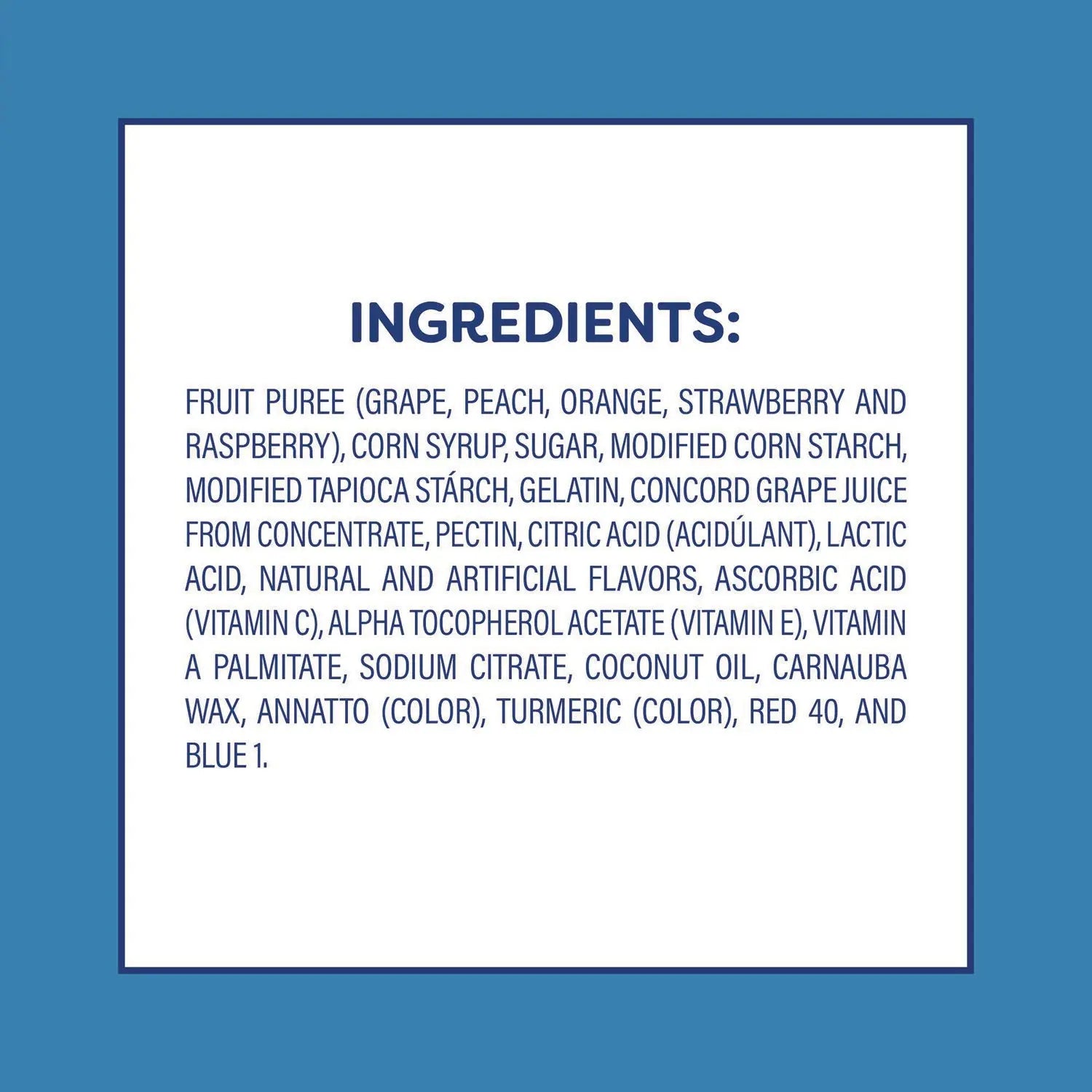 Made with real fruit, mixed fruit snacks are a delicious way to snack with purpose. Enhanced with essential daily vitamins, these yummy gummies contain 100 percent of your daily recommended vitamin C and 25 percent of your daily recommended vitamin A and E. These fruit snacks are built on the highest quality fruit grown proudly on family farms.