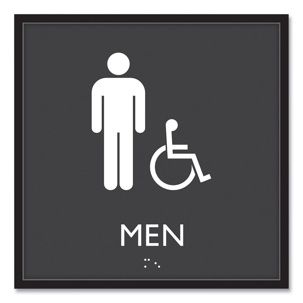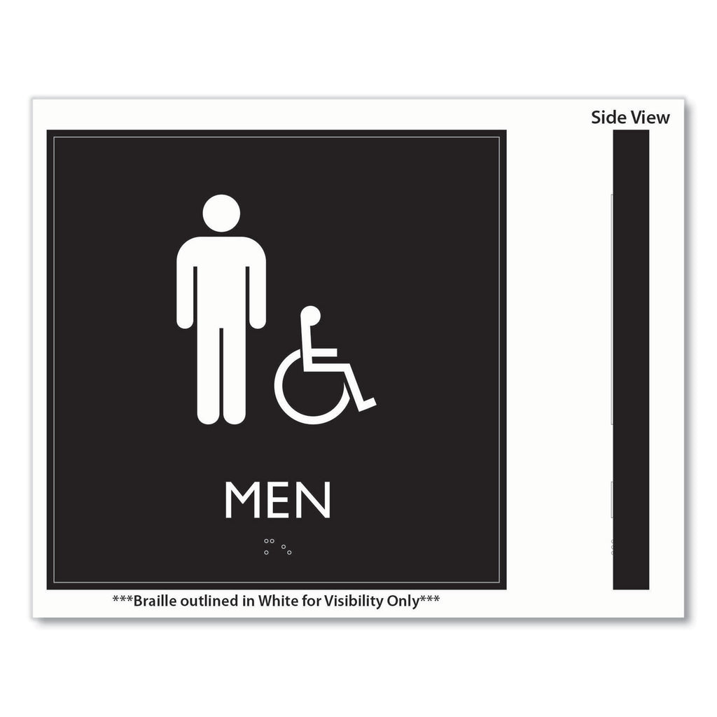 Universally and easily recognizable white graphics. Raised tactile graphics with Grade 2 Braille. Meets Americans with Disabilities Act (ADA) requirements. Includes double-side adhesive tape for mounting to door or wall.