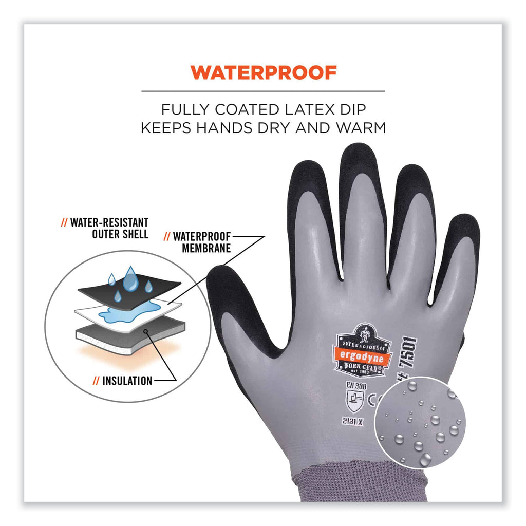 Gloves are dual layer for warm, waterproof protection in cold temperatures. Wet hands are cold hands. These coated gloves feature a full waterproof latex dip that protects you from the elements by keeping water and cold air out, with a second layer of sandy nitrile on the palms for abrasion-resistance and enhanced grip without compromised dexterity. A polyester liner with soft brushed acrylic fleece provides two levels of thermal protection. A double-lined interior, 15 g polyester topped with 10 g of brushed acrylic fleece, keep hands toasty and comfortable without bulk. These waterproof work gloves meet the EN388 standard for cut resistance. They are ideal for work in cold wet environments, including material handling and construction.