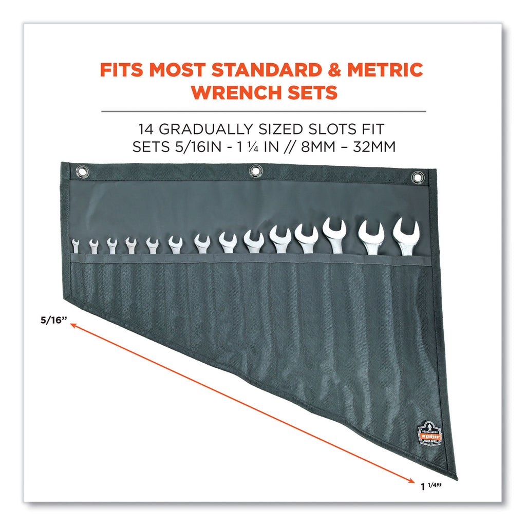 This wrench organizer roll up features 14 gradually sized slots for convenient transport, easy organization and durable protection of wrench sets. Made with 1680D ballistic polyester, heavy-gauge nylon stitching and a water-repellant finish to protect tools through the everyday grind. This space-saving wrench organizer rolls up and securely ties shut to stow neatly in trucks, buckets, work benches and more. The durable tie straps tightly close to prevent wrenches from spilling out, while also acting as a carrying handle for easy transport from site to site. Three nickel-plated grommets allow the organizer to be hung for convenient storage and access. One size fits most standard and metric wrench sets. This wrench holder is ideal for workers needing a compact solution for storing, organizing and transporting wrench sets, including construction, carpentry and electrical.