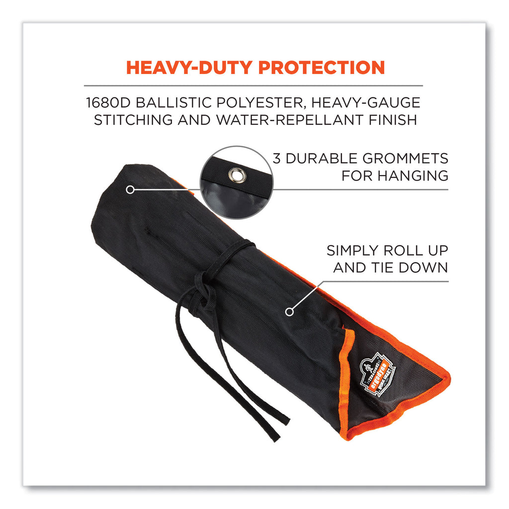 - Compact storage rolls up and securely ties to save space in trucks, buckets, work benches and more.