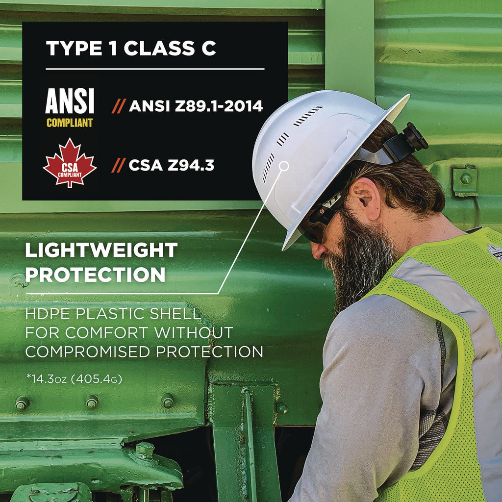 - Lightweight high-density polyethylene (HDPE) shell is 15% lighter weight than PC-ABS hard hats.