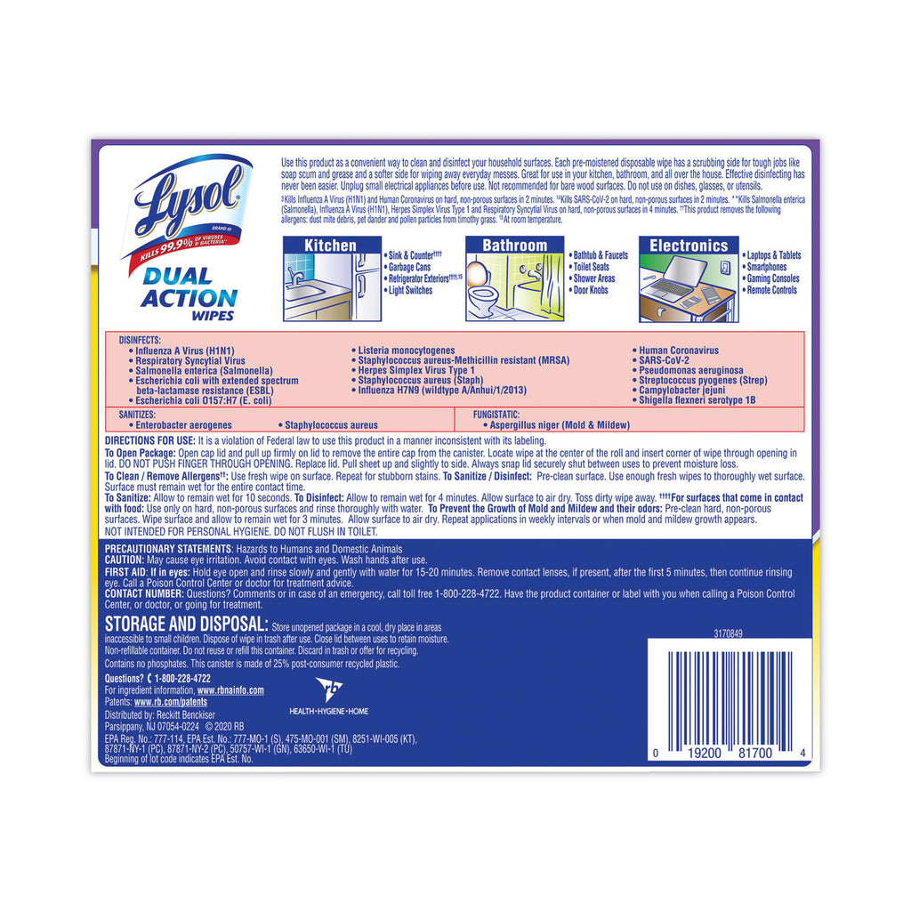 - Kills 99.9% of viruses and bacteria, including cold and flu viruses, Salmonella, E. Coli, MRSA, RSV, Staph, and Strep, when used as directed on hard, non-porous surfaces.