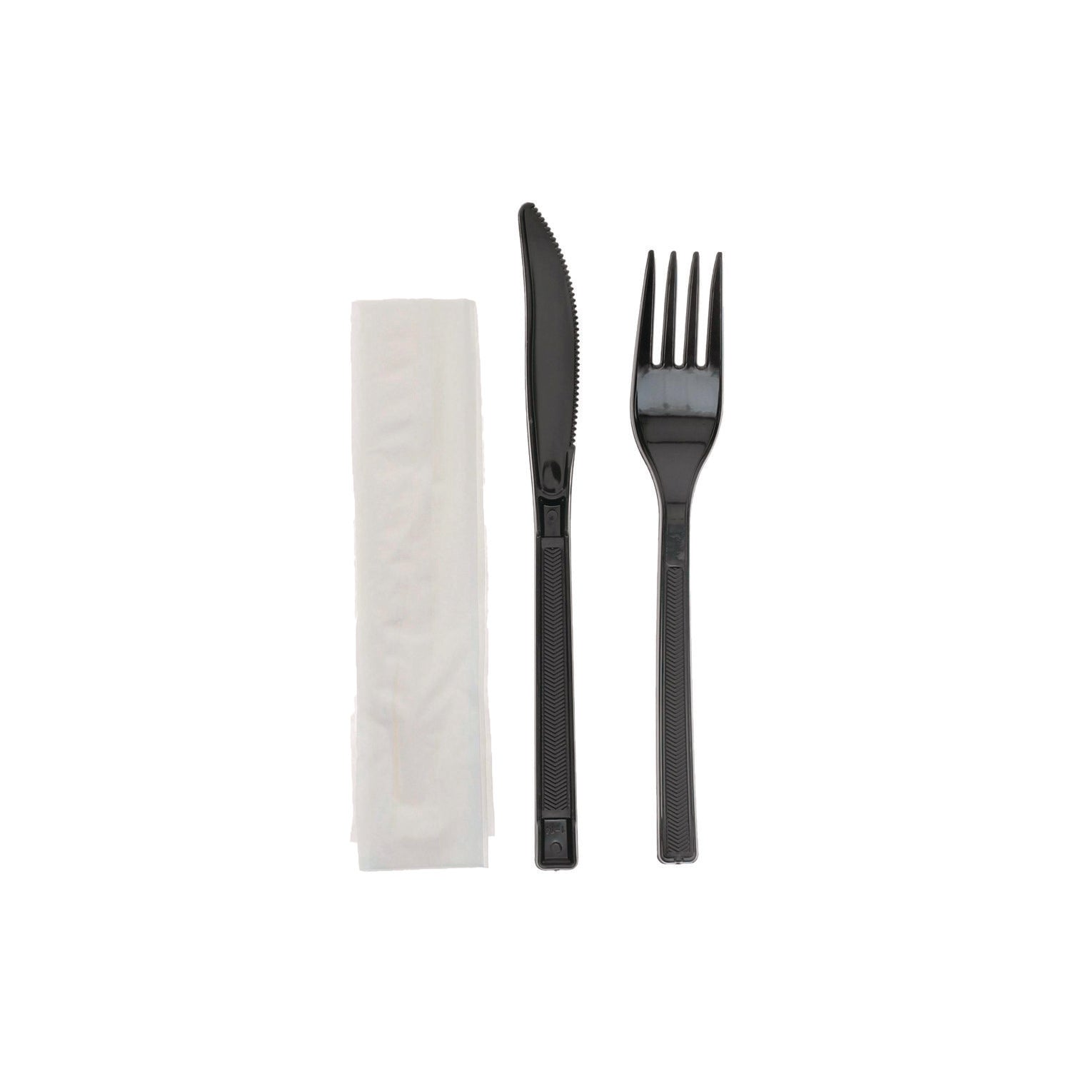 Pactiv Evergreen Gardenware Cutlery Kit, Individually Wrapped, Heavyweight, Fork/Knife/Napkin, Plastic, Black, 500/Carton