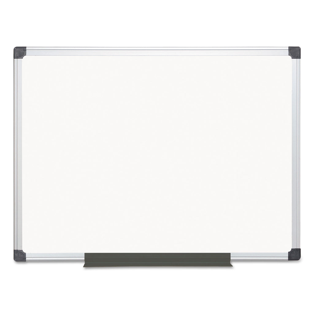 Melamine surface dry erase board is designed for occasional use and excellent value. Sturdy anodized aluminum frame includes a snap-on pen tray. Vertical or horizontal mounting is easy with the four-corner system.