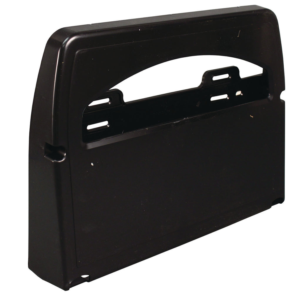 Made from plastic for durability while remaining lightweight. May be mounted by two-way tape or screws to fit most washroom needs. Capable of holding up to two packs of 250 half-fold toilet seat covers.