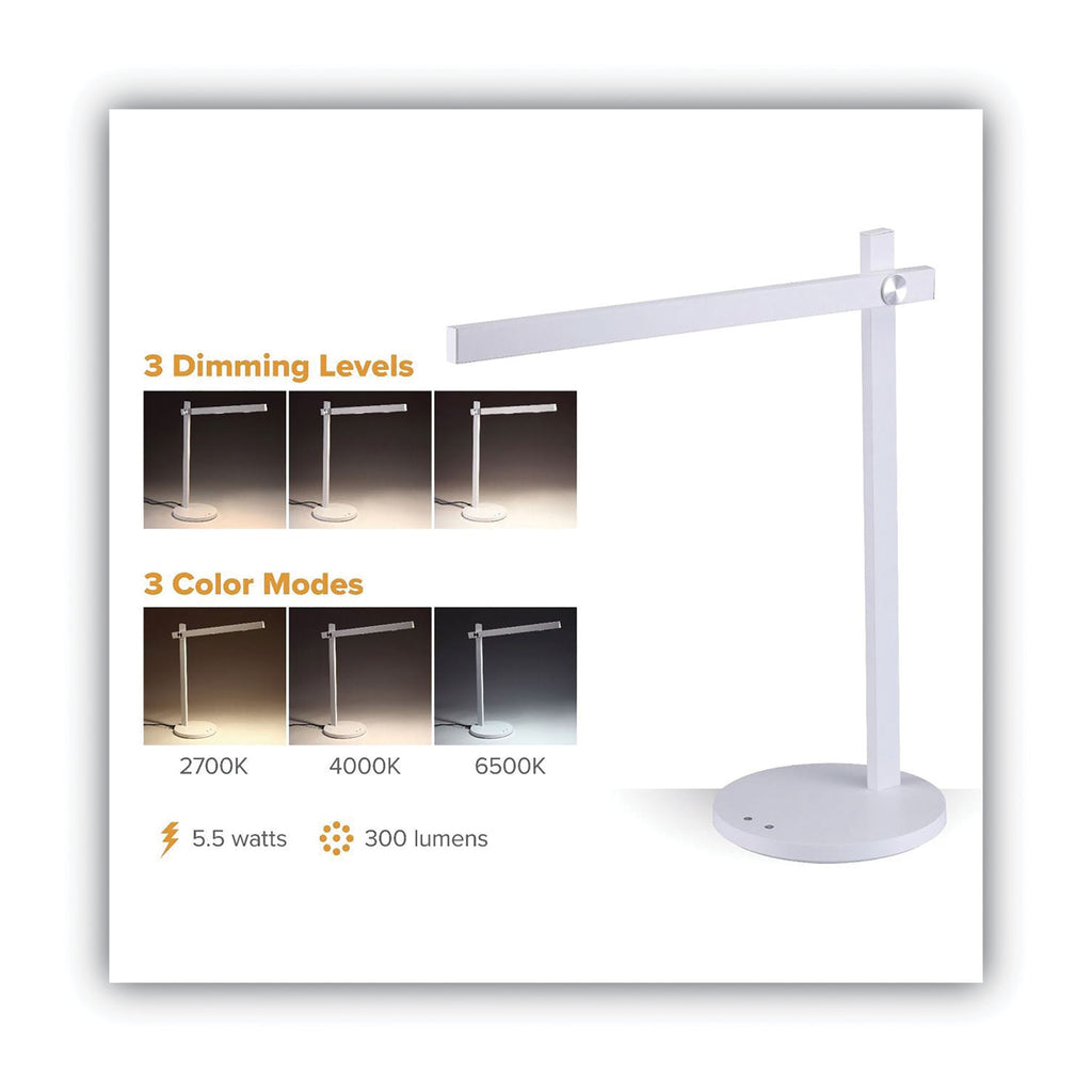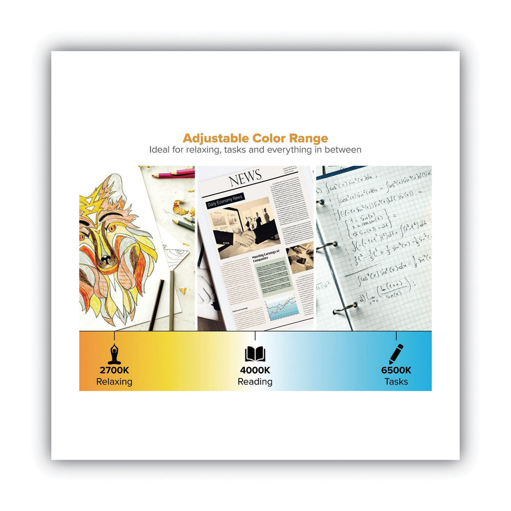 Inverted-L-bar format features a 180° pivoting arm for angling the lamp head to achieve the perfect lighting zone. Three adjustable temperature modes, with associated brightness intensities, allow you to tailor the lighting for resting, focusing or reading. Cost-effective LEDs last for up to 50,000 hours of continuous use and require 85% less energy than incandescent lamps. Shadow, flicker-, halo- and glare-free.