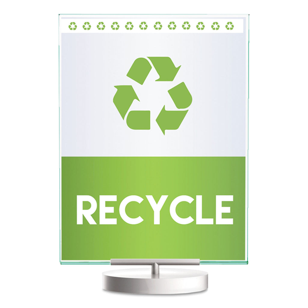 Rotating display panels allow signage to be viewed on both sides. Sign holder rotates and base stays stationary. Clear panes feature green-tinted edges, providing the look of real glass. Open on three sides making display changes easy. Personalize and print signs from your own printer using Deflecto's free online SignCreator®.
