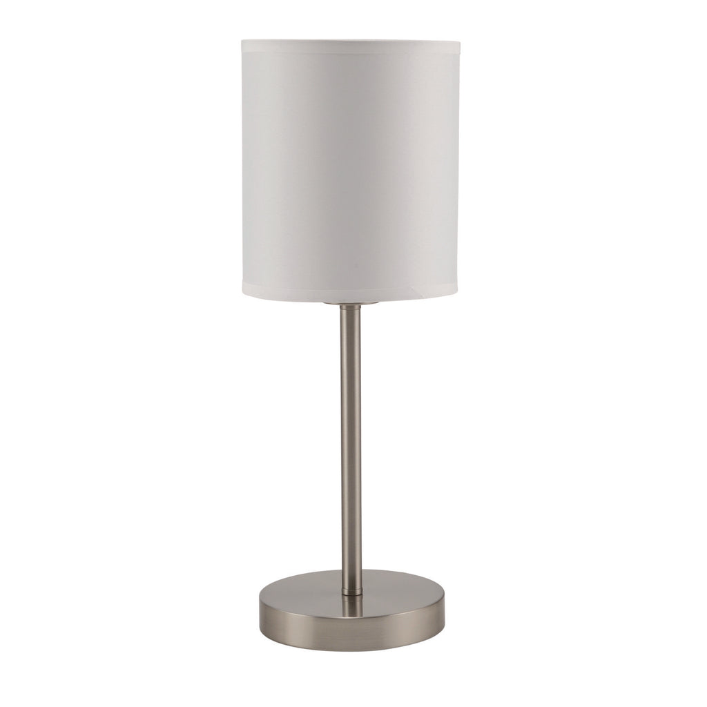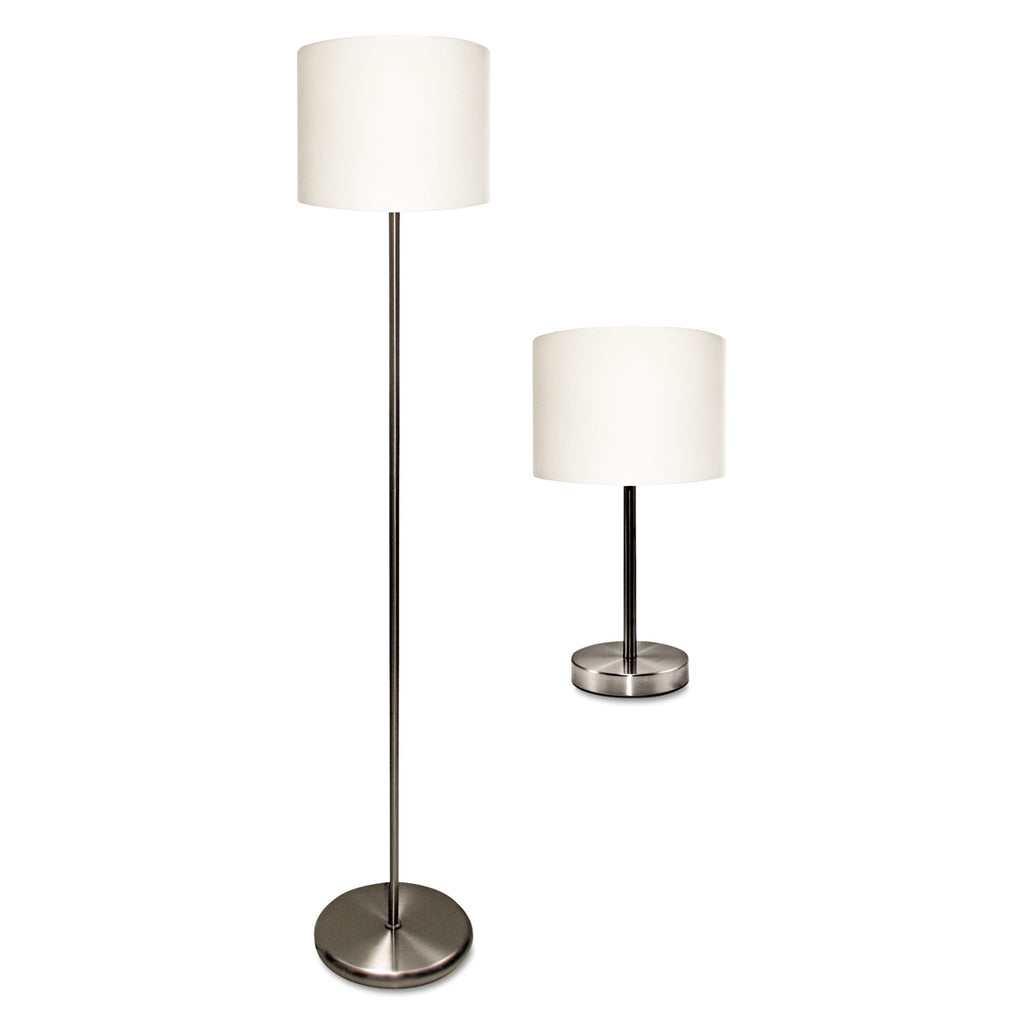Set includes a table lamp and floor lamp. The simple, contemporary design blends seamlessly with most any style of décor. The steel column and weighted base is capped with a white linen shade to diffuse the light and provide a warm ambience. Both lamps include an energy efficient 13 W CFL bulb that emits lighting equivalent to a traditional 60 W light bulb.
