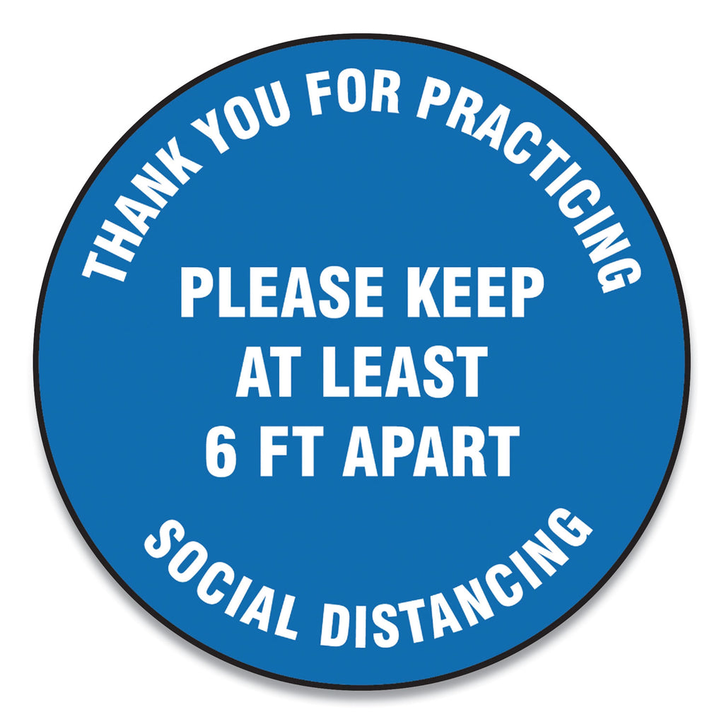 Alert and remind visitors, customers, and employees to practice social and physical distancing to prevent the spread of COVID-19, the Coronavirus. Constructed of thick adhesive vinyl. Subsurface printed and laminated to protect the graphics and message from heavy pedestrian traffic. Non-slip, pebble-textured surface provides added durability. Strong, permanent, acrylic adhesive back with peel-off liner. Adheres firmly to smooth, clean, dry surfaces.