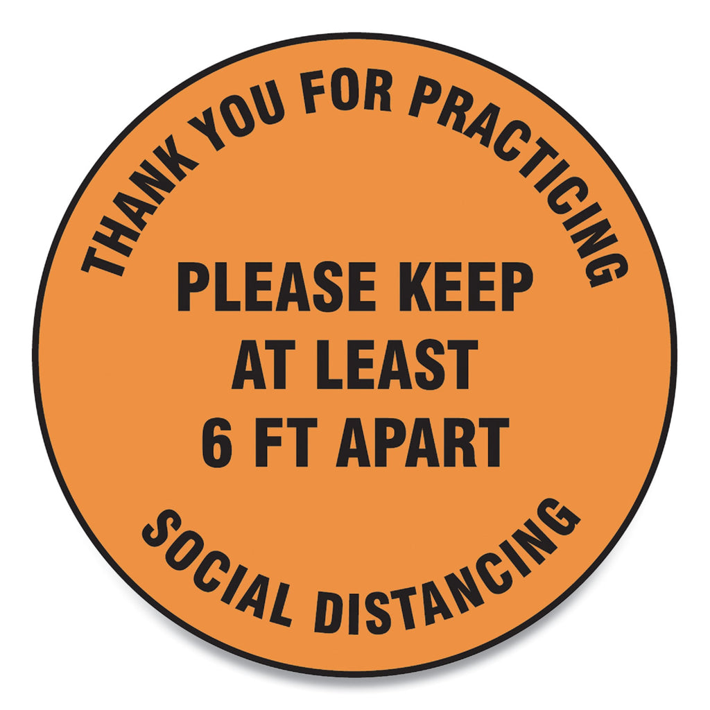 Alert and remind visitors, customers, and employees to practice social and physical distancing to prevent the spread of COVID-19, the Coronavirus. Constructed of thick adhesive vinyl. Subsurface printed and laminated to protect the graphics and message from heavy pedestrian traffic. Non-slip, pebble-textured surface provides added durability. Strong, permanent, acrylic adhesive back with peel-off liner. Adheres firmly to smooth, clean, dry surfaces.
