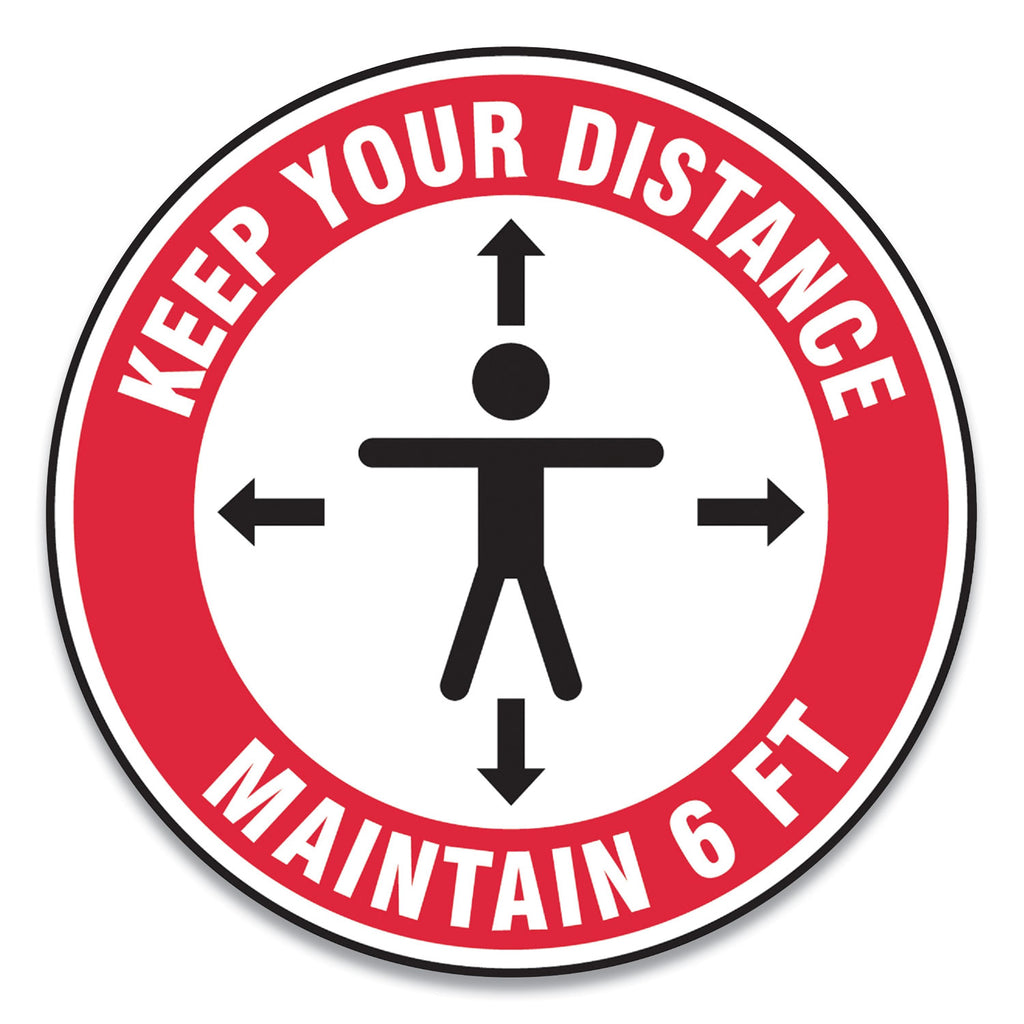 Alert and remind visitors, customers, and employees to practice social and physical distancing to prevent the spread of COVID-19, the Coronavirus. Constructed of thick adhesive vinyl. Subsurface printed and laminated to protect the graphics and message from heavy pedestrian traffic. Non-slip, pebble-textured surface provides added durability. Strong, permanent, acrylic adhesive back with peel-off liner. Adheres firmly to smooth, clean, dry surfaces.