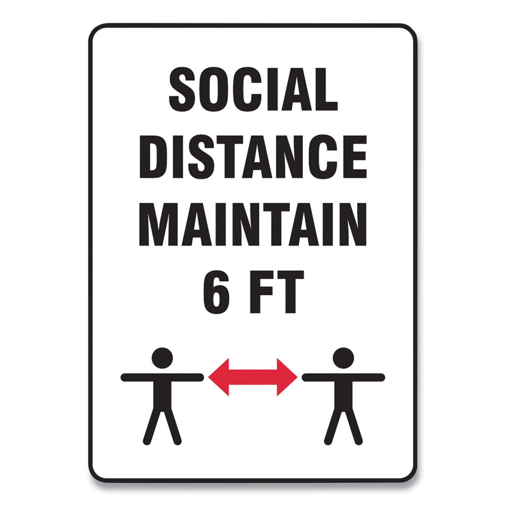 Alert and remind visitors, customers, and employees to practice social and physical distancing to prevent the spread of COVID-19, the Coronavirus. Durable plastic has slight flex that is ideal for indoor and sheltered outdoor environments. Printed surface has clear UV protective overcoat. Recycled content with UV inhibitors and good impact resistance. Rounded corners with 3/16" mounting holes for installation.