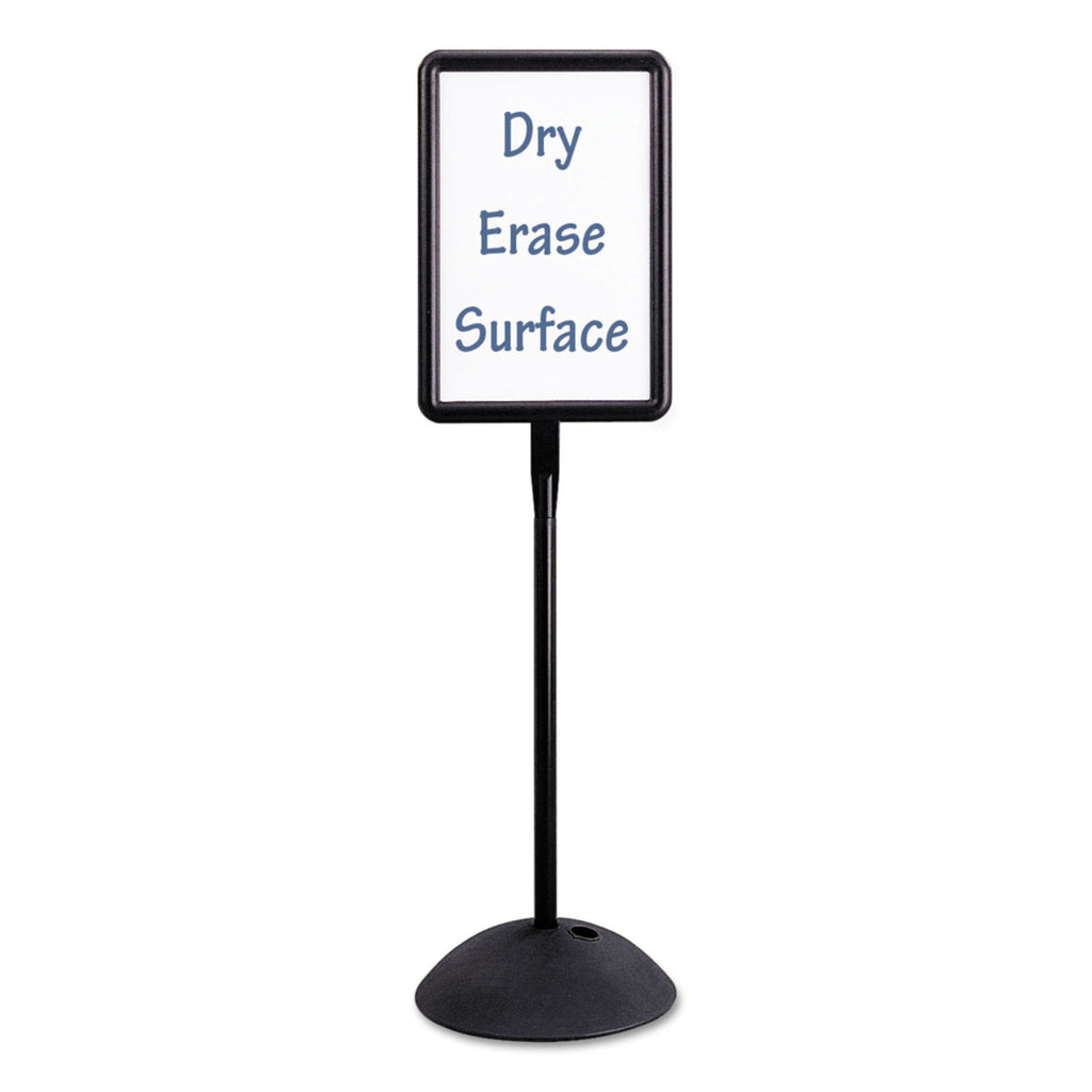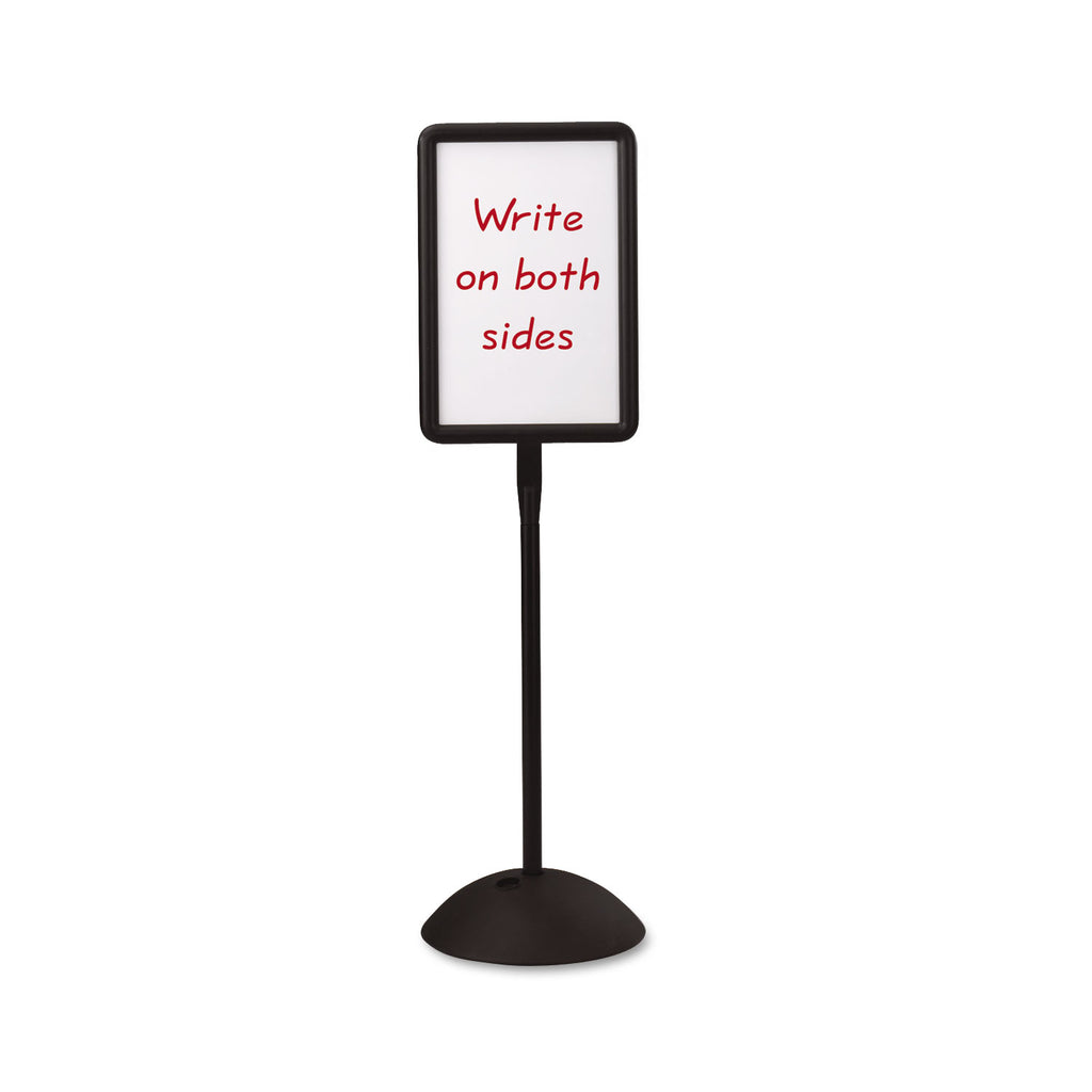 Dual sided, magnetic, steel dry-erase board is designed to be easily noticed in any area. Molded construction features UV inhibitors, making it great for indoor or outdoor use. 18" diameter base can be weighted with water or sand for stability.