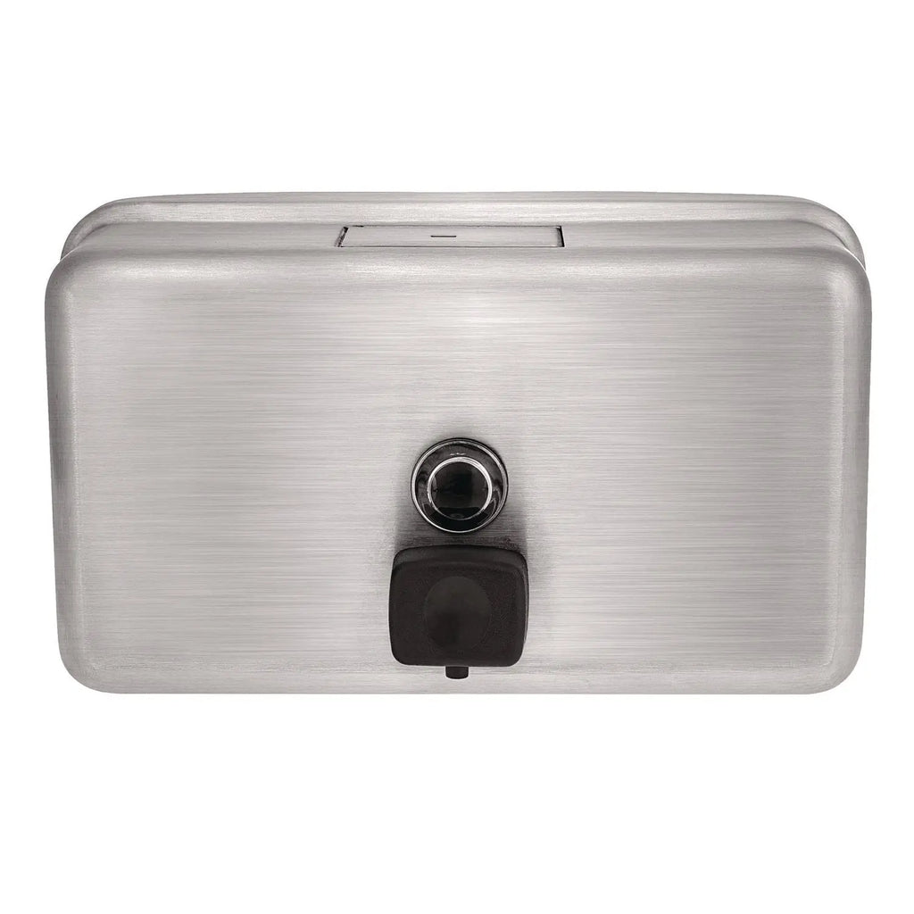 This horizontal manual soap dispenser is ideal for restrooms in offices, restaurants, health care facilities, schools, hospitals and more. The tank is constructed of durable, corrosion-resistant stainless steel with a brushed finish and is vandal-resistant. Valve dispenses commercially marketed all-purpose hand soaps.