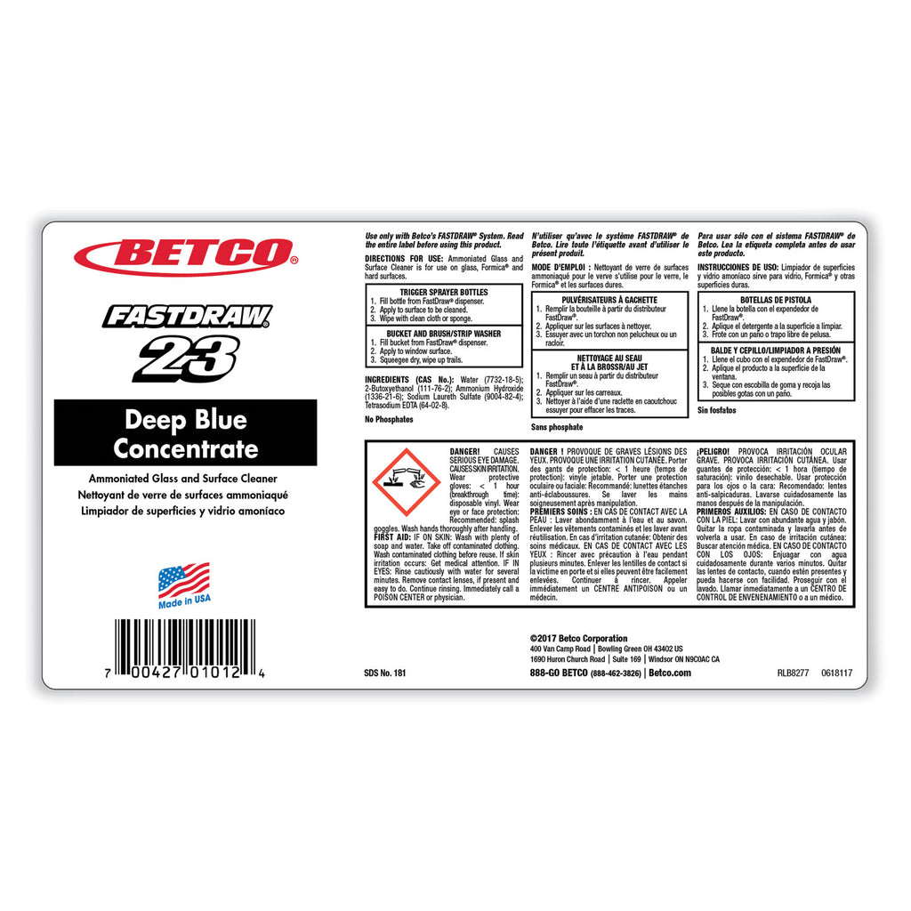 Quickly penetrate dust, smoke, grease and grime on all glass and window surfaces. Excellent for cleaning stainless steel, Formica, plastic, porcelain and chrome. Fortified with ammonia for powerful cleaning. Brightens hard surfaces as it cleans. Use undiluted for heavy-duty glass and surface cleaning. Spray glass cleaner on surface to be cleaned and wipe with a lint free towel or squeegee. Works with all FastDraw dispensing options.