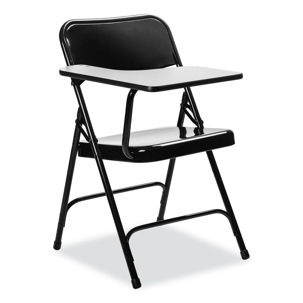 These folding chairs have enhanced the comfortable, bestselling 200 Series model with a practical folding tablet-arm writing surface. Attached to the steel chair frame is an elegant ample-sized 22 inch long by 11 inch wide surface fortified with dual underside brackets.