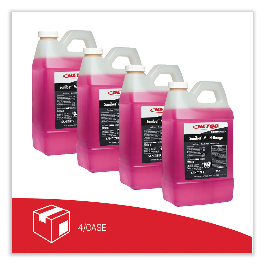 This EPA-approved broad range sanitizer delivers correct sanitizing at a range of 150-400 ppm, allowing the sanitizing solution to adapt to varying water pressure situations while maintaining compliance with health department regulations. Multi-Range Sanibet kills 99.99% of food service organisms such as Listeria, E-Coli, and Salmonella. A versatile product, it can be used to sanitize serving ware, utensils, pots and pans, and food processing equipment. It can also be used for disinfecting floors and walls. It is a complete, chemically balanced disinfectant, sanitizer that is effective even in the presence of hard water. Highly concentrated, this product provides a low end use cost per gallon. Multi-Range Sanibet has a red color indicator which provides visual confirmation of use. One bottle yields 17 gal. Works with all FastDraw dispensing options.