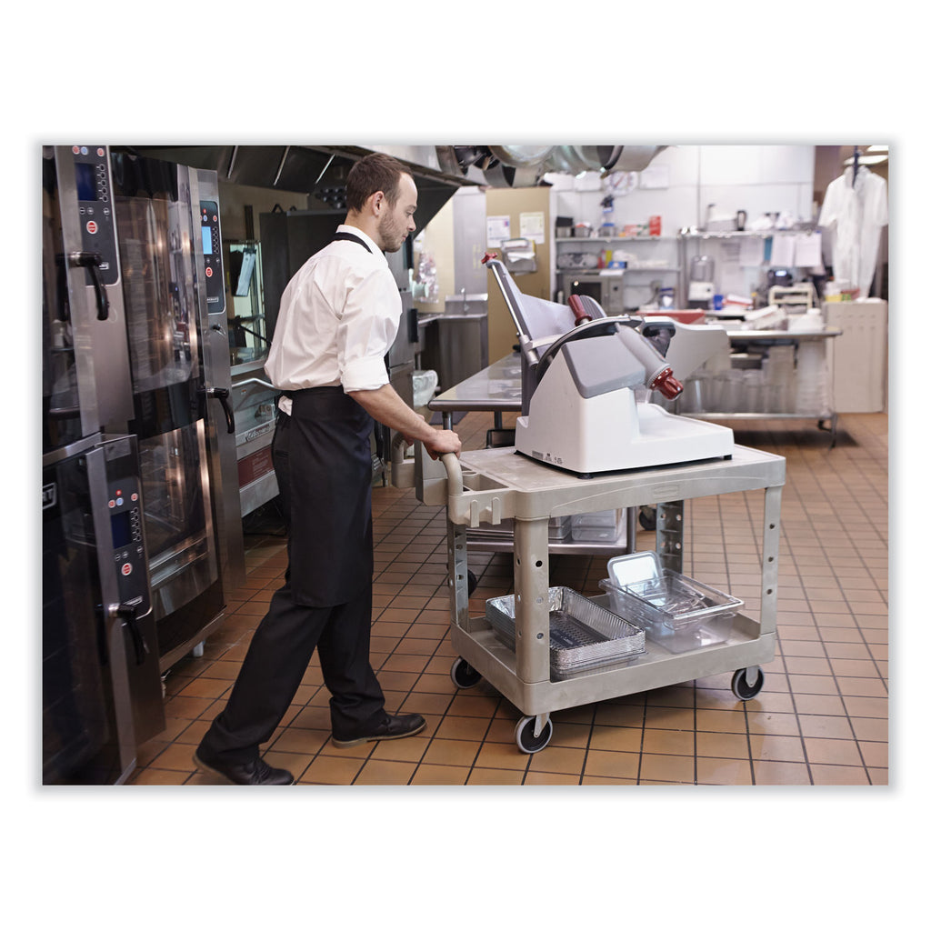 The Rubbermaid HD Utility Cart is perfect for transporting materials, supplies, and heavy loads in almost any environment. Ergonomically-designed push handle provides optimum hand placement and push height, improving control and worker safety. Molded-in storage compartments, holsters, hooks, and notches for ideal storage. The rolling utility cart features molded-in customizable fittings. High-density structural resin construction. Easy-access bottom shelf. Best-in-class casters to meet the most demanding environments.