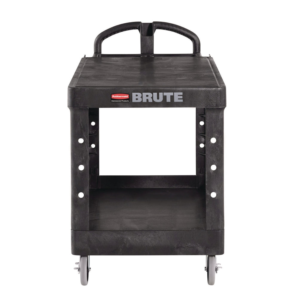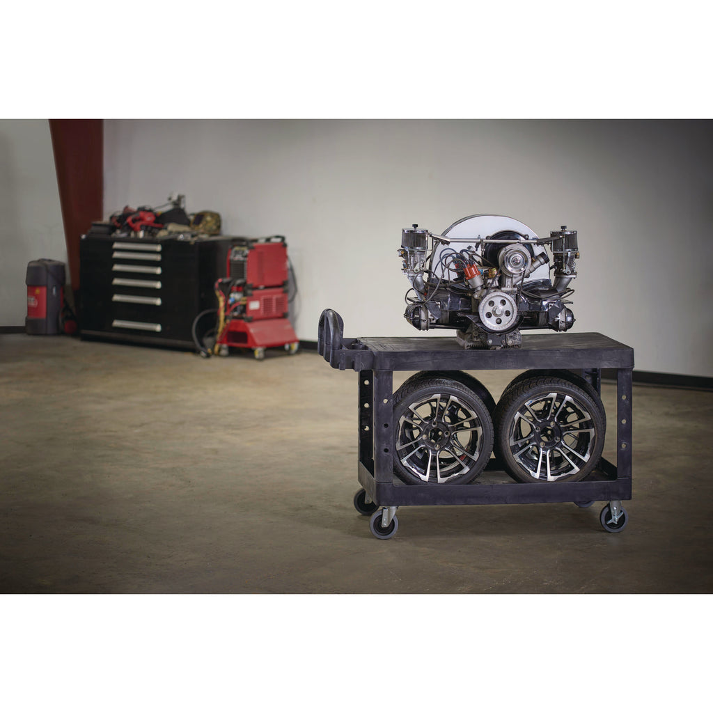 This utility cart is perfect for transporting materials, supplies, and heavy loads in almost any environment. Ergonomically-designed push handle provides optimum hand placement and push height, improving control and worker safety. Molded-in storage compartments, holsters, hooks and notches for ideal storage. The rolling utility cart features molded-in customizable fittings. High-density structural resin construction. Easy-access bottom shelf. Best-in-class casters to meet the most demanding environments.