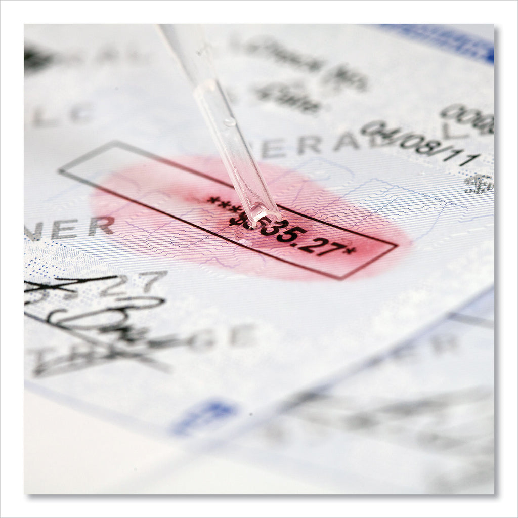 Formulated according to world-wide banking standards. Prevent check tampering and alteration with high-quality MICR Toner Secure. Contains a hidden red security agent. If chemical alteration is attempted a red stain will appear.