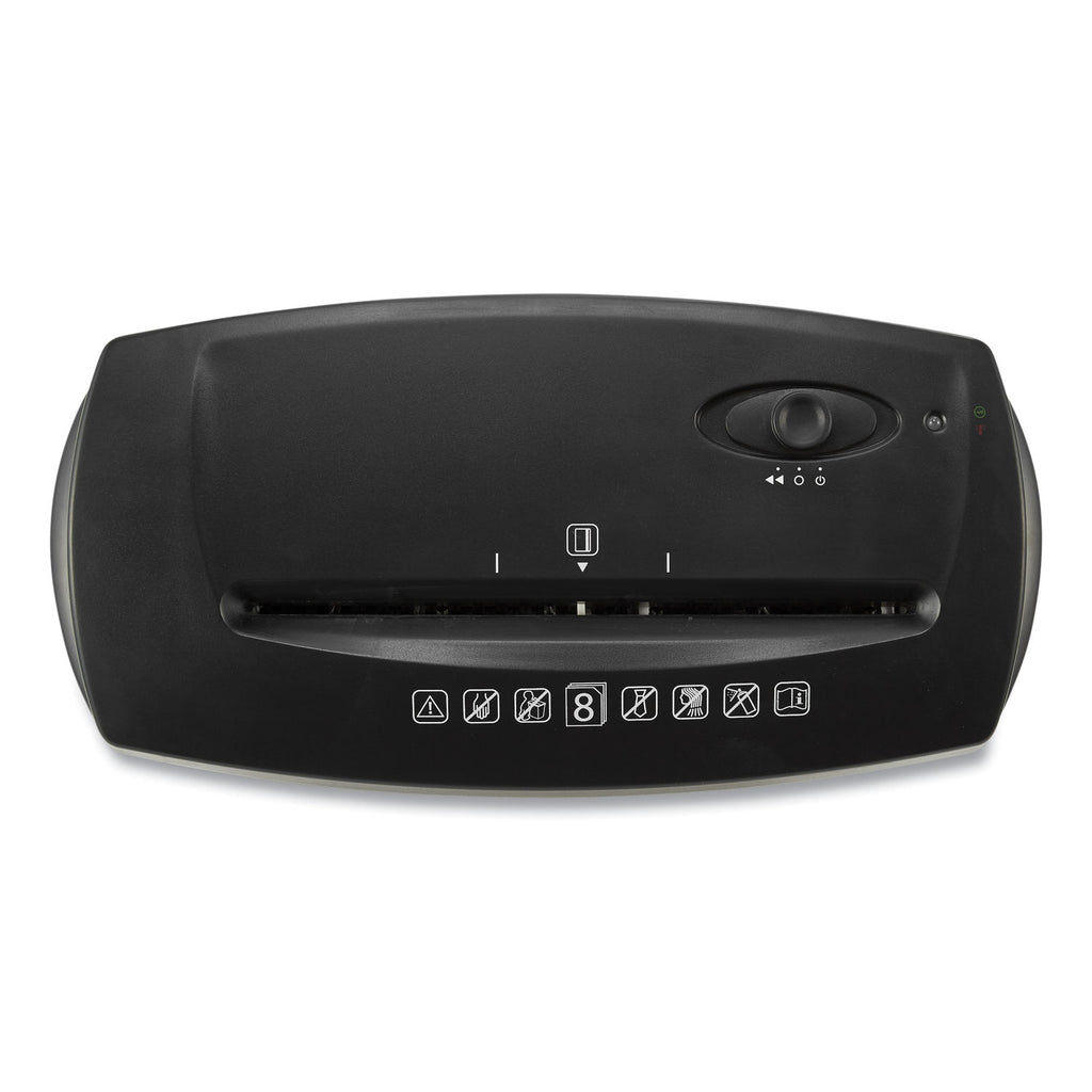 - 8-sheet cross-cut shredder shreds credit cards and staples.