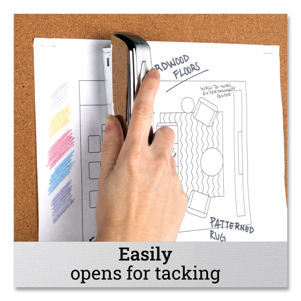 High quality all metal desktop stapler designed for durability. This high performing stapler features an inner-rail to deliver a jam-resistant accurate staple. Opens to tack to vertical surfaces like a bulletin board.