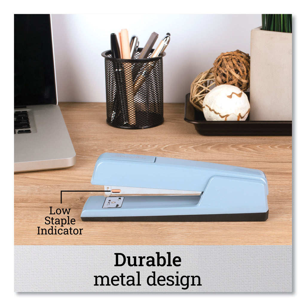 One of America's top-selling manual desktop staplers: simple, accurate, reliable and strong. Metal construction makes this stapler especially durable. Inner rail helps to reduce jamming and positive locking latch keeps the magazine in place during use. 100% Performance Guarantee.