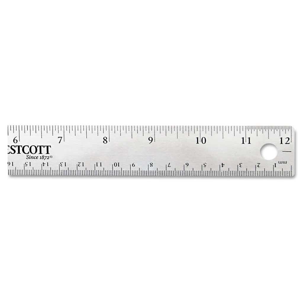 Nearly indestructible stainless steel ruler with a nonslip cork base and a hang-up hole. Etched standard and metric measurement markings. 1/32" gradations in the first and last inch.