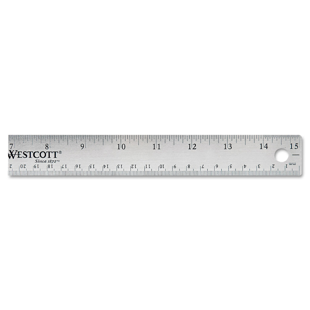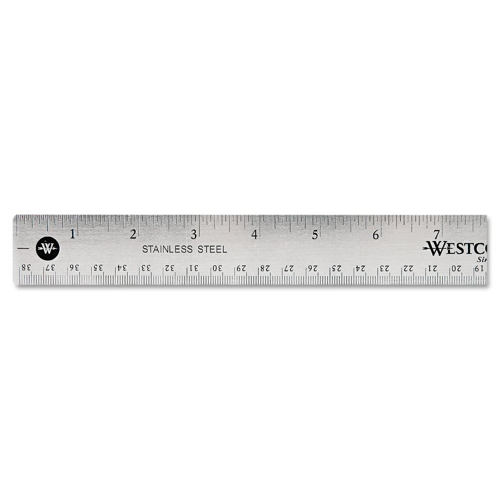 Nearly indestructible stainless steel ruler with a nonslip cork base and a hang-up hole. Etched standard and metric measurement markings. 1/32" gradations in the first and last inch.