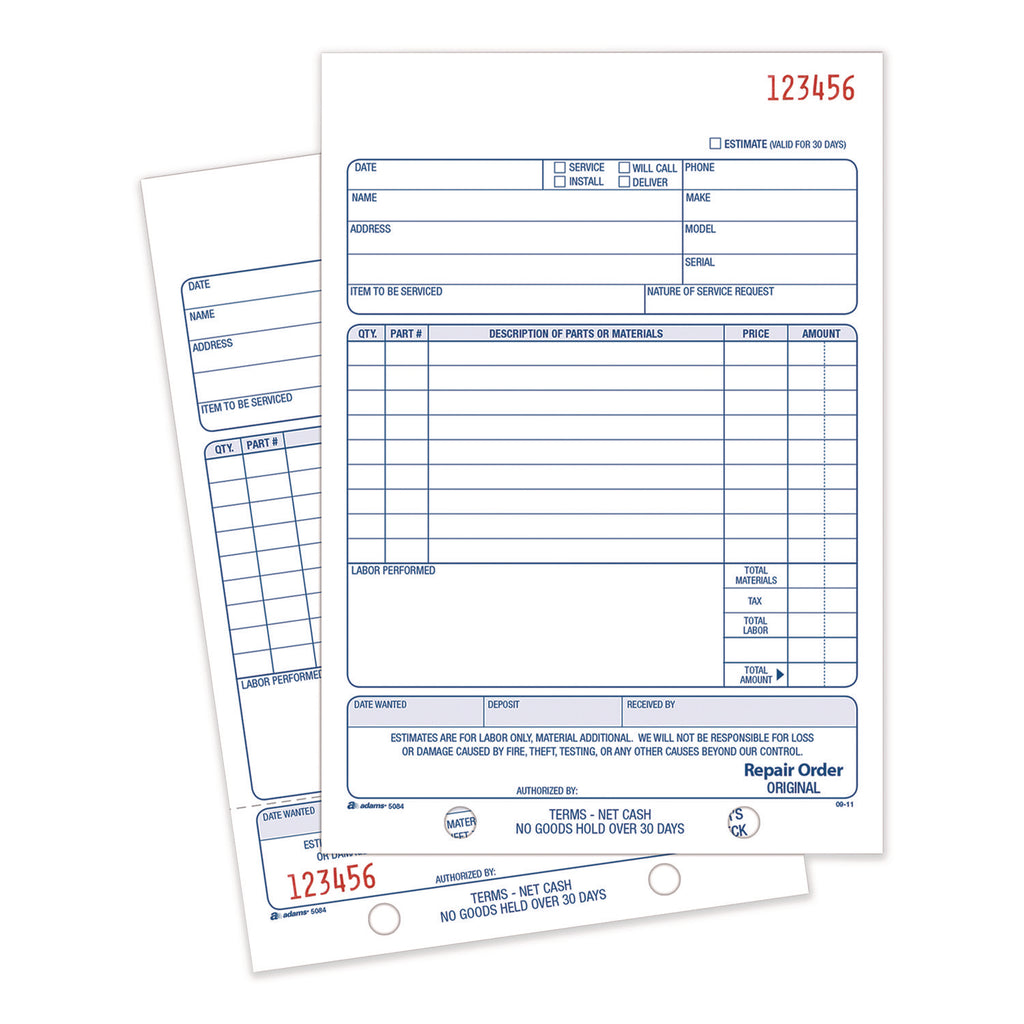 Ideal for a wide variety of repair orders and associated estimates, these forms feature plenty of space for itemized parts/materials and labor cost descriptions as well as dedicated areas for the important administrative aspects. Carbonless, multipart design—each set features a perforated claim check on the last copy. Wraparound cover.