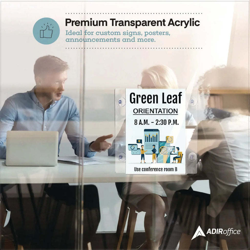 Posting temporary notices for employees, customers, special events, sales, opening/closing hours no longer needs reliance on cellophane tape, masking tape or similar stickums that leave messy residue on glass walls, doors and windows when the event is over. The AdirOffice clear acrylic sign holder is the best alternative to taped notices and subsequent challenges of removing tape residue from glass surfaces.