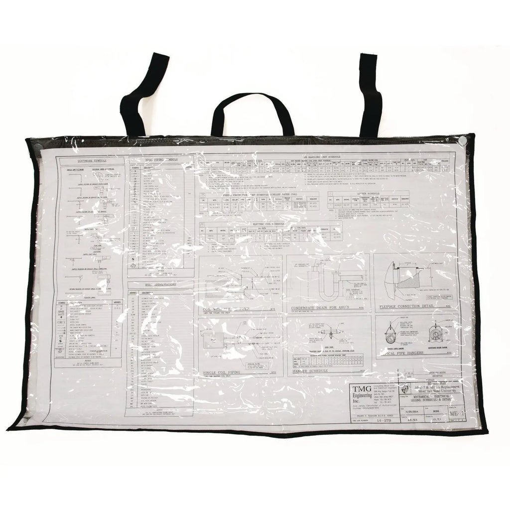 Weather-resistant carrying case used by building contractors, architects, engineers, artists or anyone handling drawings or blueprints. The Plan Shield is made of clear plastic and durable black nylon that can withstand construction site conditions.