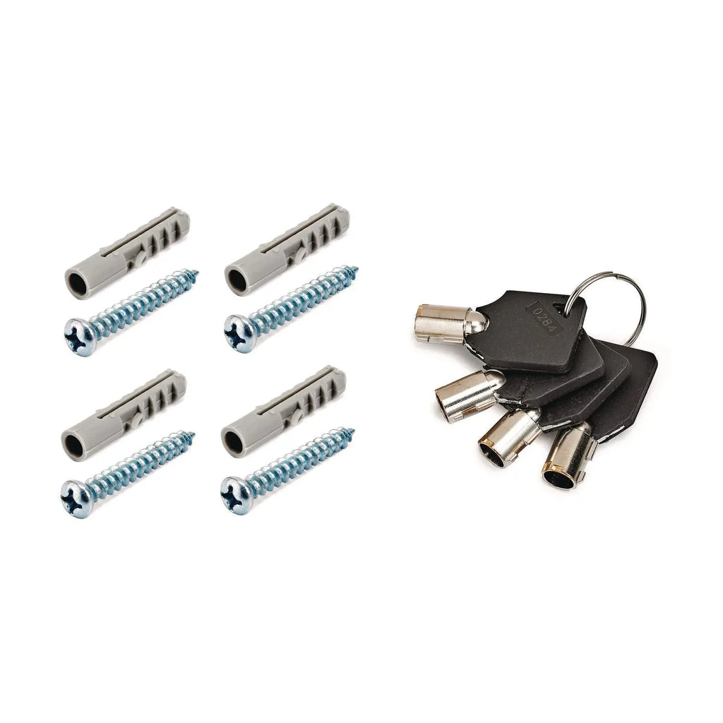 - Mounting hardware is included and four, tubular-design keys which are difficult to duplicate.