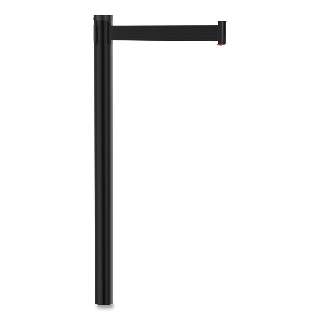 - 2" black nylon tape is housed in post head, extends up to 10 ft and retracts slowly and safely.