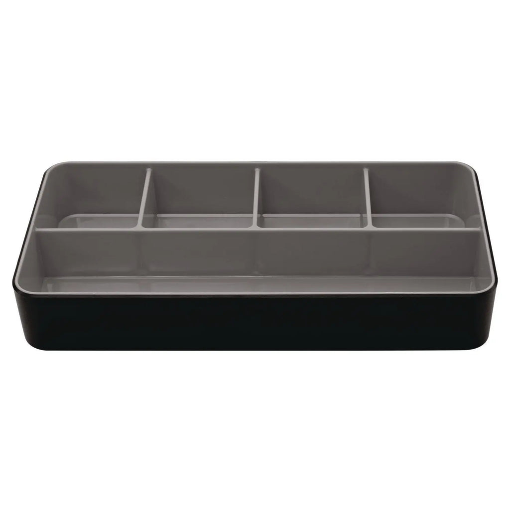 Clean, modern space-shaper that organizes small desk accessories. High-gloss, rolled edges provide bold contrast and sleek, modern design. Five separate compartments divide pens, pencils, paper clips and more. Plastic-infused durability.