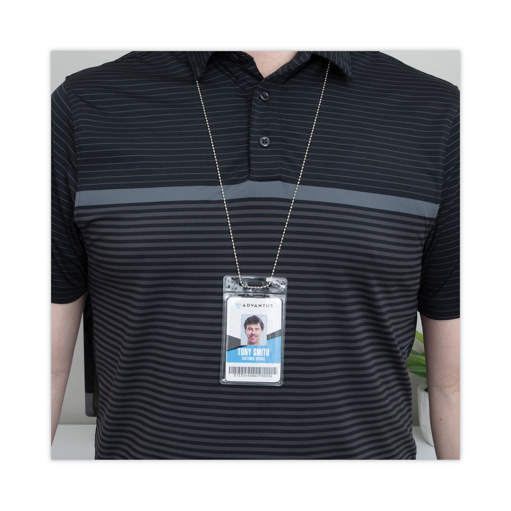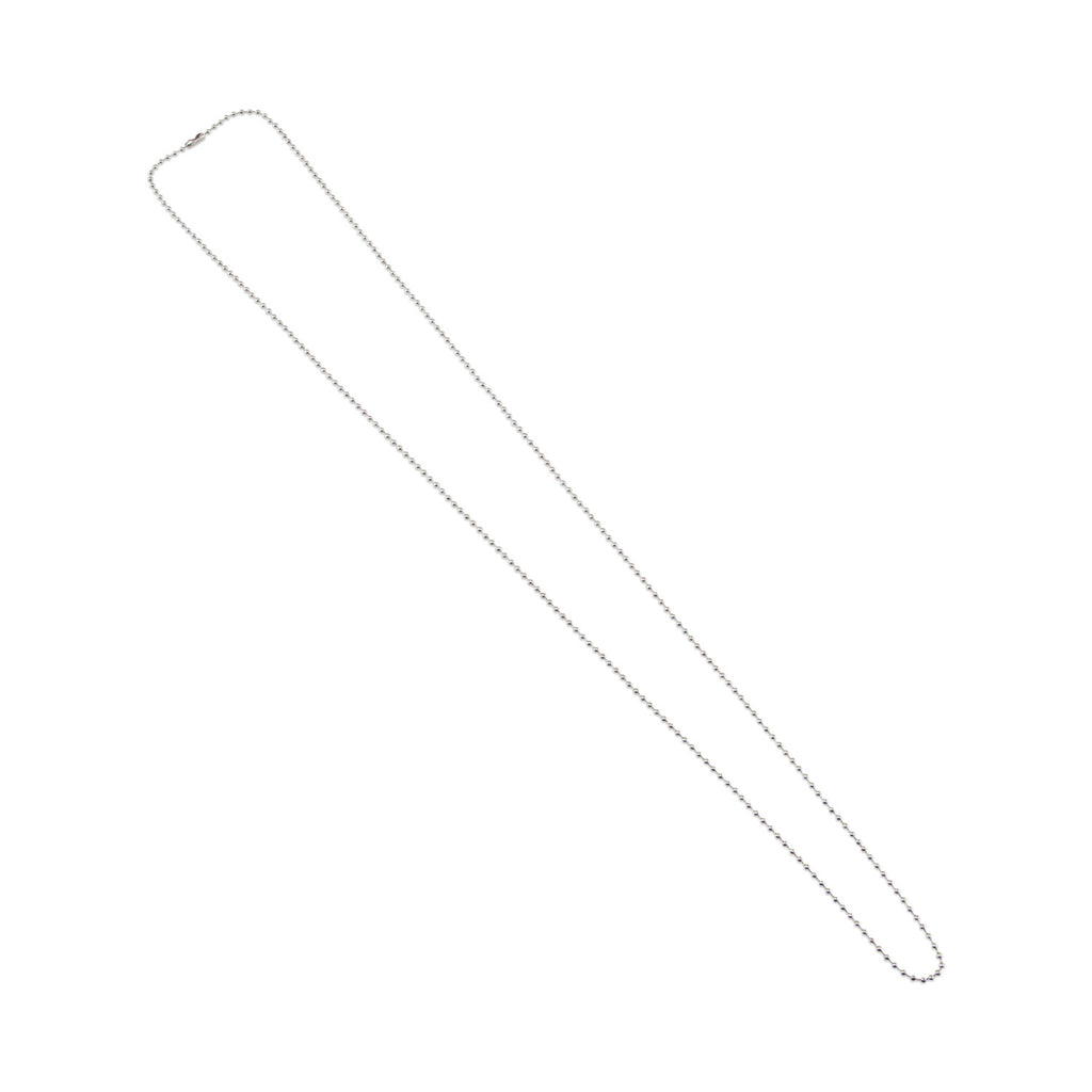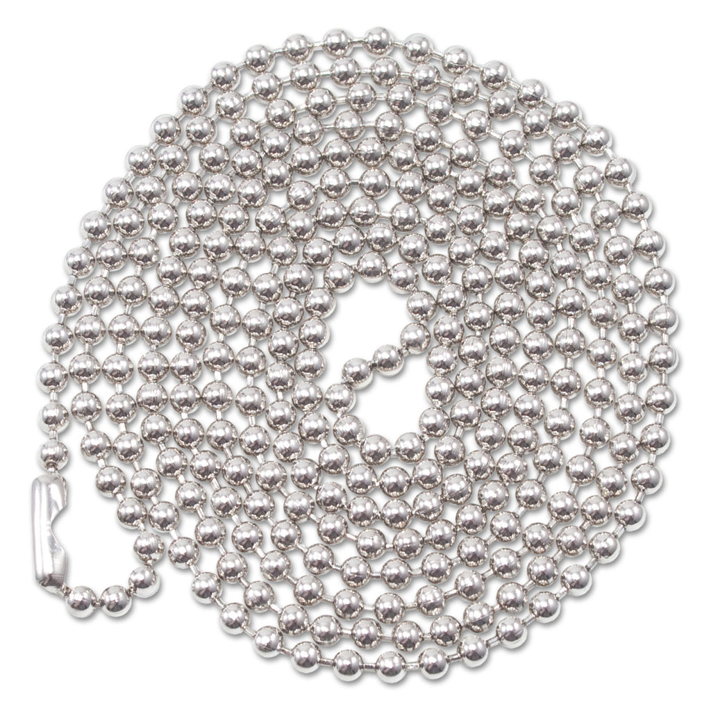 36" long nickel-plated chain has a strong connector to ensure constant closure. Designed to keep badge always in view. Rounded beads won't stick to clothing.