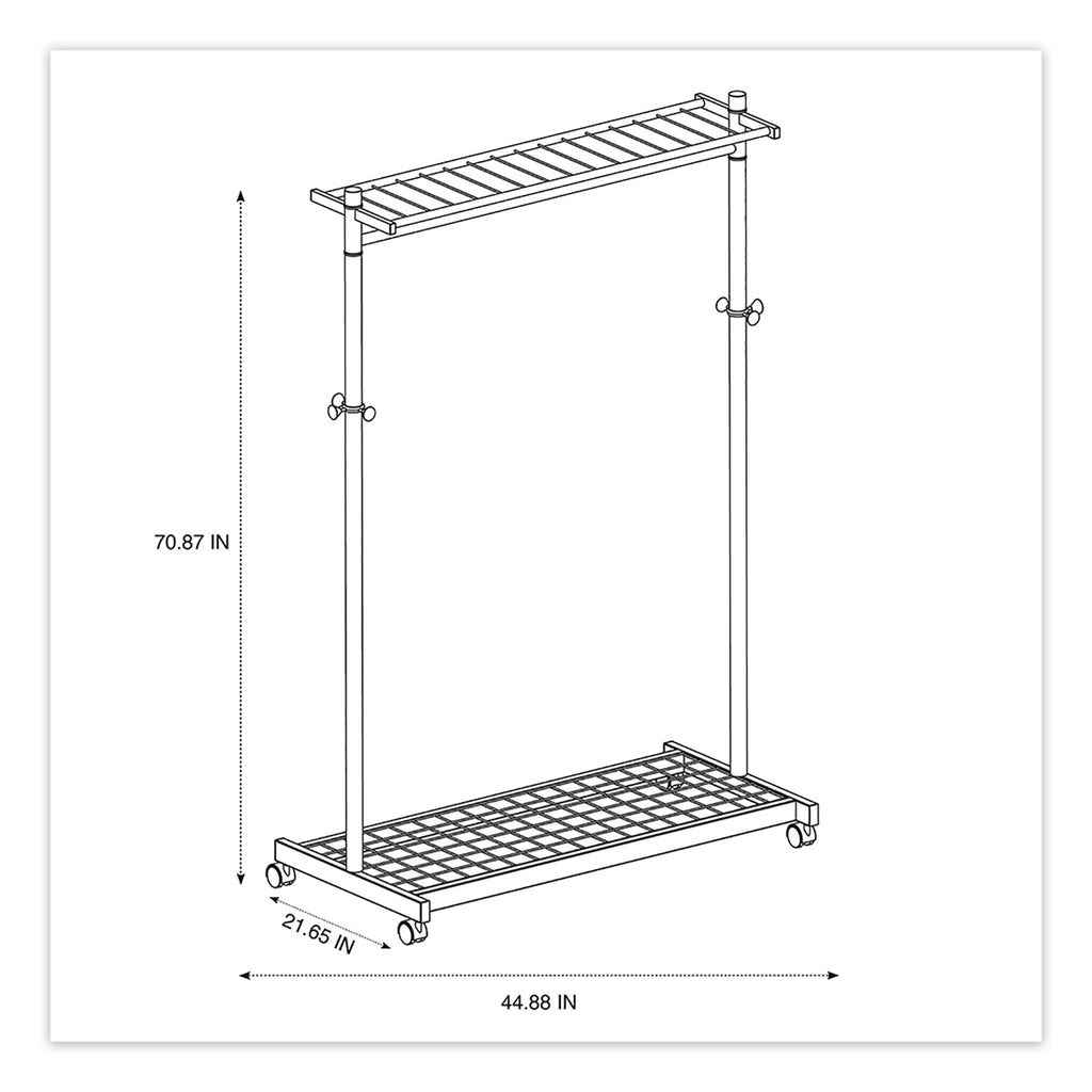 Stylish combination of steel tubing and wood detail. Features six accessory hooks and four casters, two locking. Holds up to 36 garment hangers. Six hangers included.
