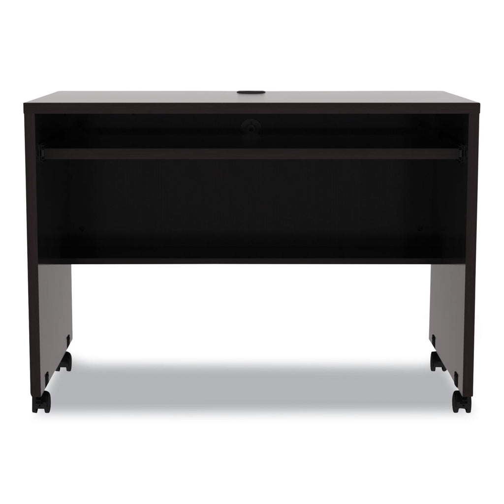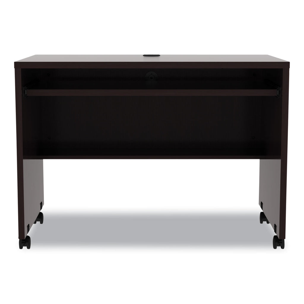 Portable mobile workstation desk goes anywhere you need it. Scaled to fit in tight spaces and designed to pass through standard doorways to go from room to room. Full width, full-extension, slide-out keyboard tray. Commercial-grade laminate worksurface and side panels are water, scratch, and dent-resistant. Protective edge banding helps prevent damage from bumps. Two grommets for cable and wire management. Undermount interior shelf for quick storage and to hold wires when moving. Three-fourths height back modesty panel for privacy. Four casters (two locking) for mobility.