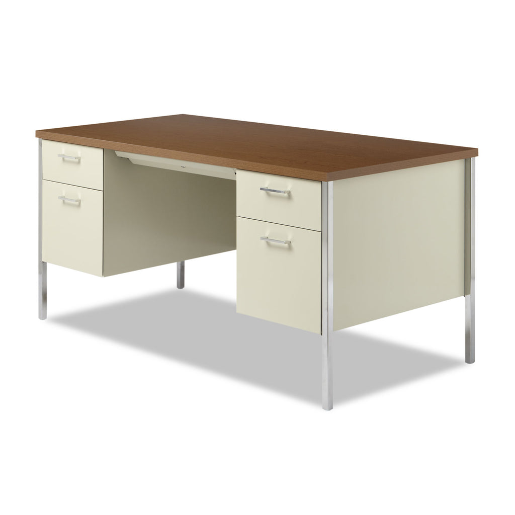 Solid and stable desk with square edge, laminated top that is scratch- and stain-resistant. Built with a durable, powder-coated steel frame with 1" square, tubular steel legs. Includes a full extension, locking file drawer with telescoping ball bearing slides to accommodate hanging file folders. Box drawer operates on steel roller suspensions. Center drawer lock secures all drawers. Aluminum drawer handles. Three-quarter height modesty panel provides privacy. Leveling glides adjust for uneven floors.