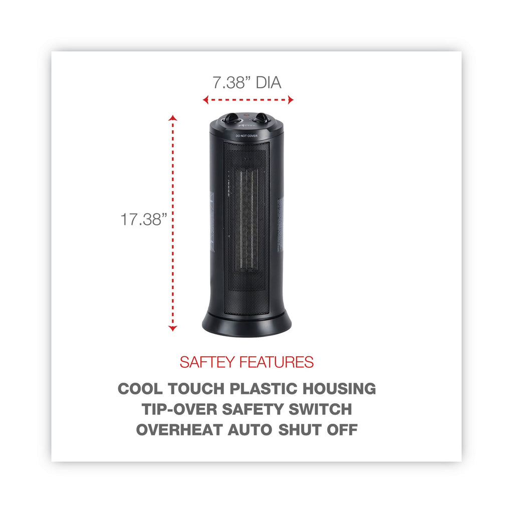 The oscillating mini tower heater delivers heat where you need it. Air is warmed as it passes over a large ceramic and aluminum heating element, and heat is dispersed by a powerful fan. Adjustable thermostat up to 1500-watt heating output for maximum comfort. Designed with safety in mind with overheat auto-shut off protection, tip-over safety switch, and a cool-to-the-touch plastic housing.