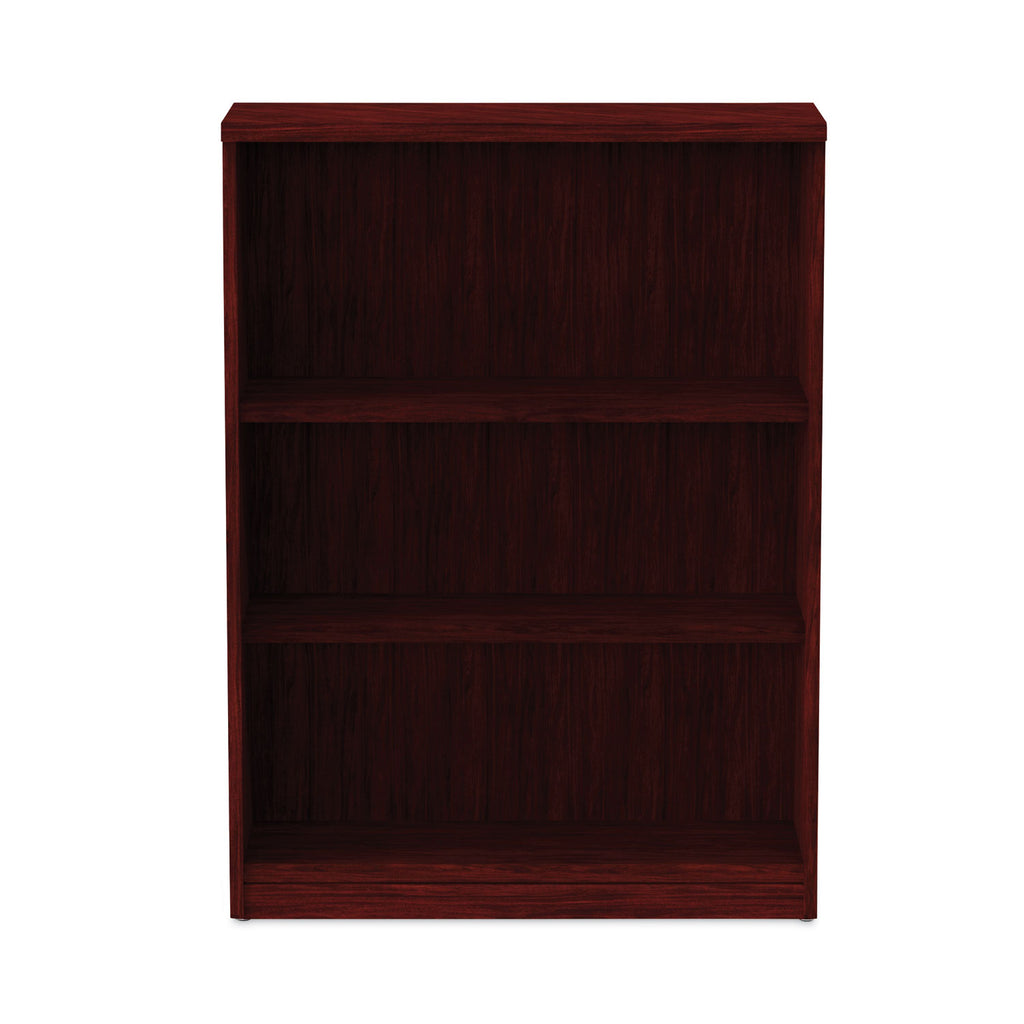 Contemporary design; woodgrain laminate construction. Commercial-grade side panels with protective 3 mm edge banding. 11.75" deep shelves. Top and bottom shelf are fixed, middle shelf is adjustable. Top panel is 14" deep for door installation. Tight, dowel, and cam-lock assembly.