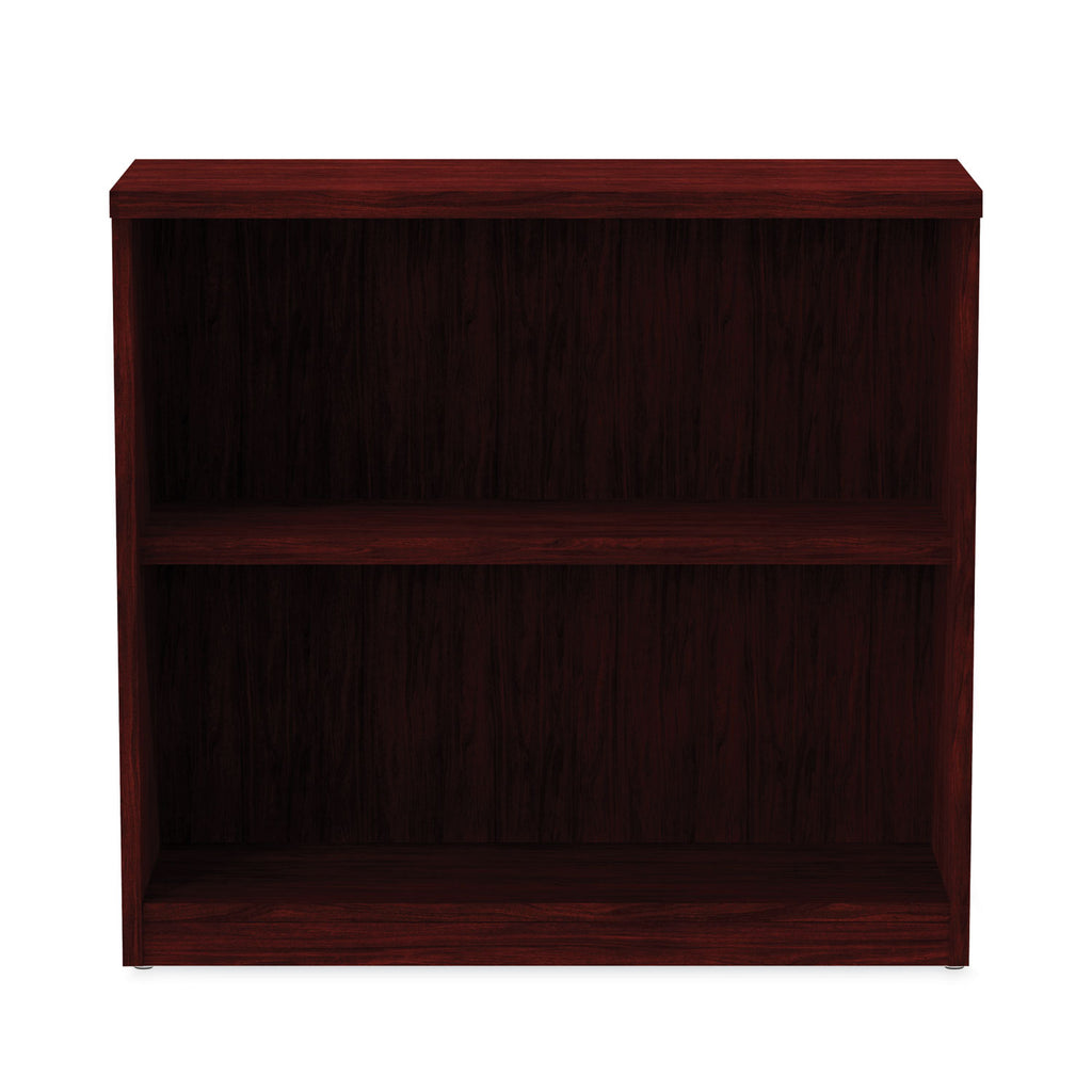 Contemporary design; woodgrain laminate construction. Commercial-grade side panels with protective 3 mm edge banding. 11.75" deep shelves. Top and bottom shelf are fixed, middle shelf is adjustable. Top panel is 14" deep for door installation. Tight, dowel, and cam-lock assembly.