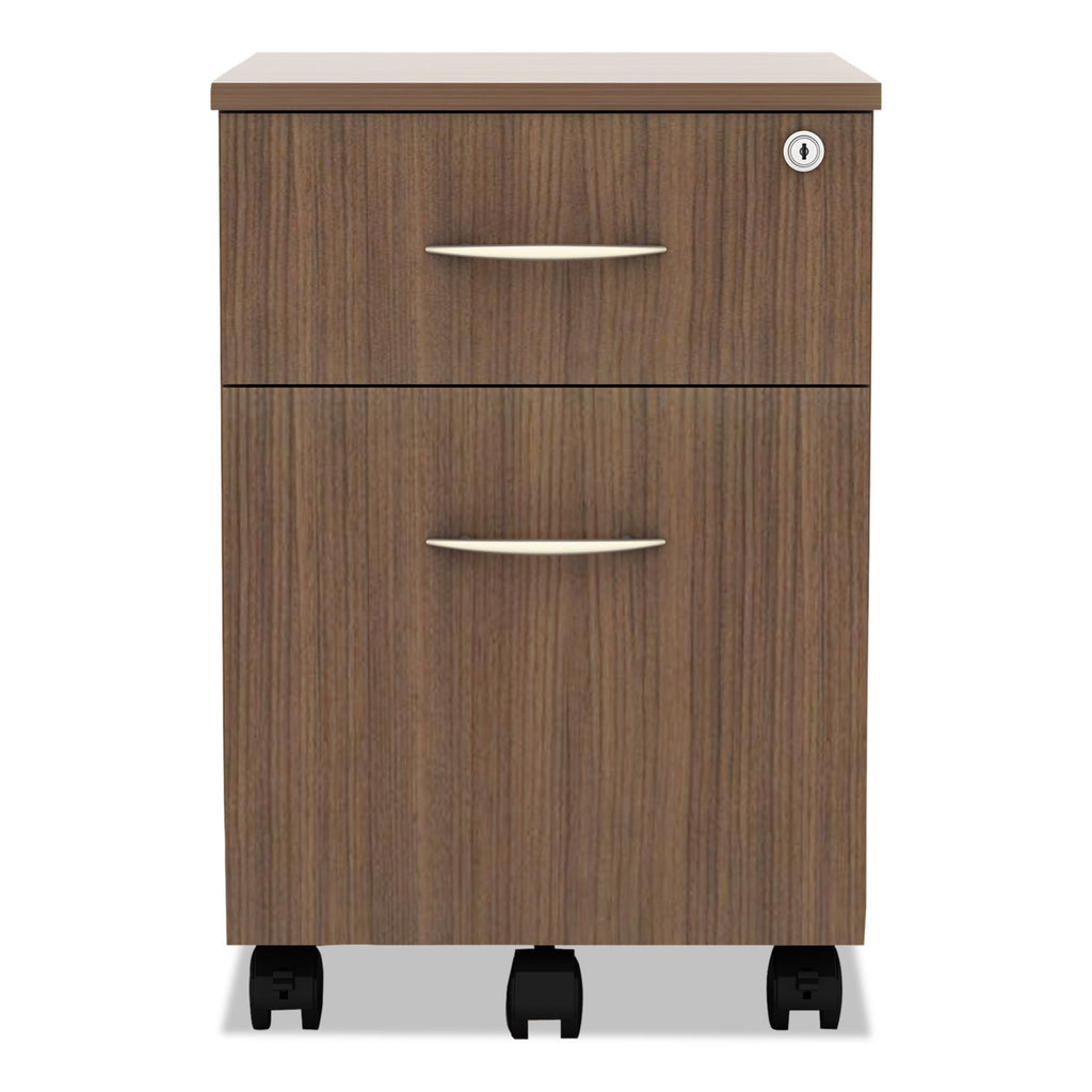 Sturdy woodgrain laminate mobile box file pedestal to store all your office necessities. Full-extension ball bearing slides on file drawer for easy access. Durable laminate is water-, scratch-, and dent-resistant with 3 mm protective edge banding. Two fold-away safety keys included. Accepts Alera® Pedestal Cushions for an instant seating option.