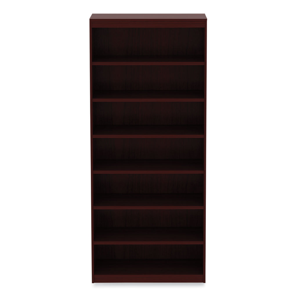 Woodgrain laminate bookcase features a contemporary design that fits perfectly in professional environments. Commercial-grade side panels with protective 3 mm edge banding provide excellent dent and scratch resistance. Generous 11.5 deep shelves accommodate three-ring binders and large publications. Quick-lock fasteners allow easy assembly. Shelf count includes fixed middle and bottom shelves.