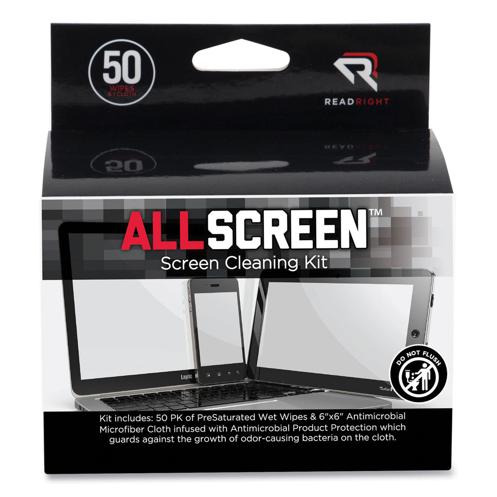 Convenient kit contains everything needed to keep screens clean. From smartphones to computer monitors, this handy kit handles them all. Kit contains individually wrapped wipes that are pre-saturated with an alcohol- and ammonia-free cleaning solution as well as a 6" x 6" reusable microfiber cloth.