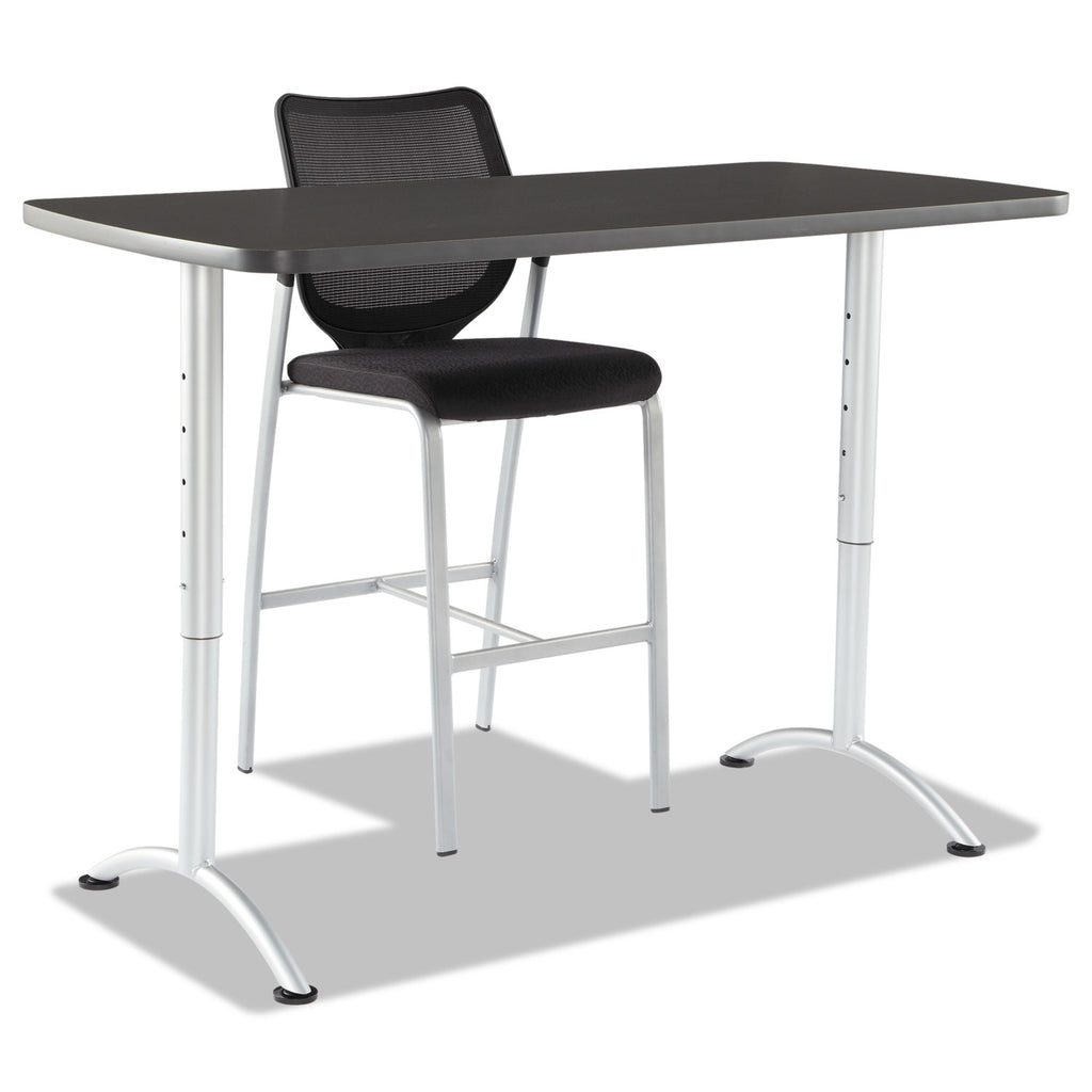 Versatile, all purpose table designed for flexible work spaces. Utilize in all areas of the office where communication and collaboration take place. Perfectly suited as a workstation, in meeting/conference rooms, or in lounges and cafes. Ergonomically healthy option to sit, stand, or lean which supports a more active work posture. Multiple height positions at pre-set 3" increments with spring button clips. 1 1/8" thick melamine top with square T-mold edging. Durable powder coated steel base with adjustable glides.